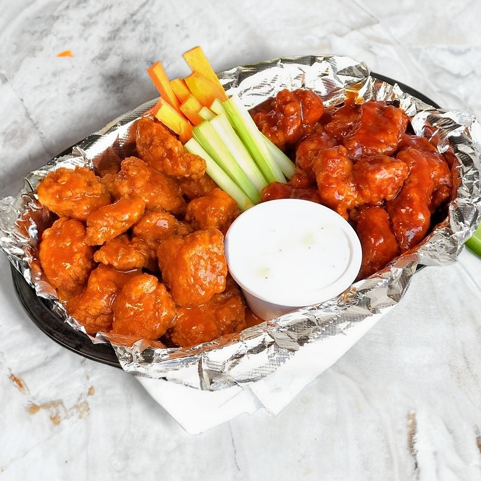 Jugosos trozos de pechuga de pollo empanizados y bañados con salsa de tu elección. Acompañados de verduras y aderezo ranch. 250 gramos y una salsa. Para preservar la calidad del producto algunas salsas se ponen aparte. Si deseas verdura extra solicítala sin costo.