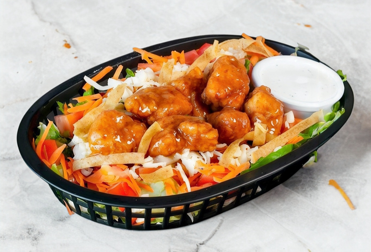 Fresca mezcla de lechugas, tomate, queso Monterrey Jack, zanahoria, tiras de totopos, boneless (150g) bañados con una salsa de tu elección y aderezo ranch.