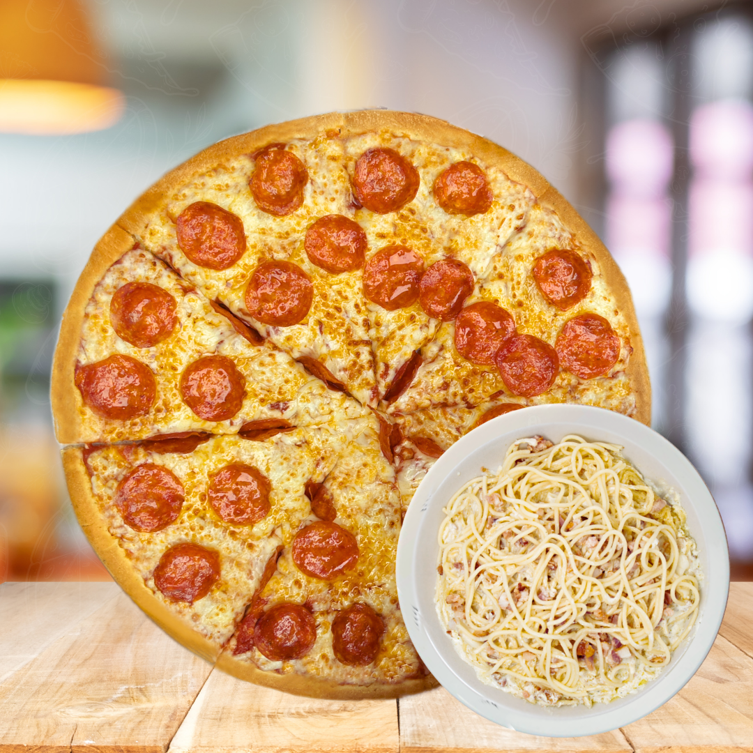 Pizza extragrande con Pepperoni y queso cheddar chihuahua y 1/2 litro de Espagueti con salsa alfredo