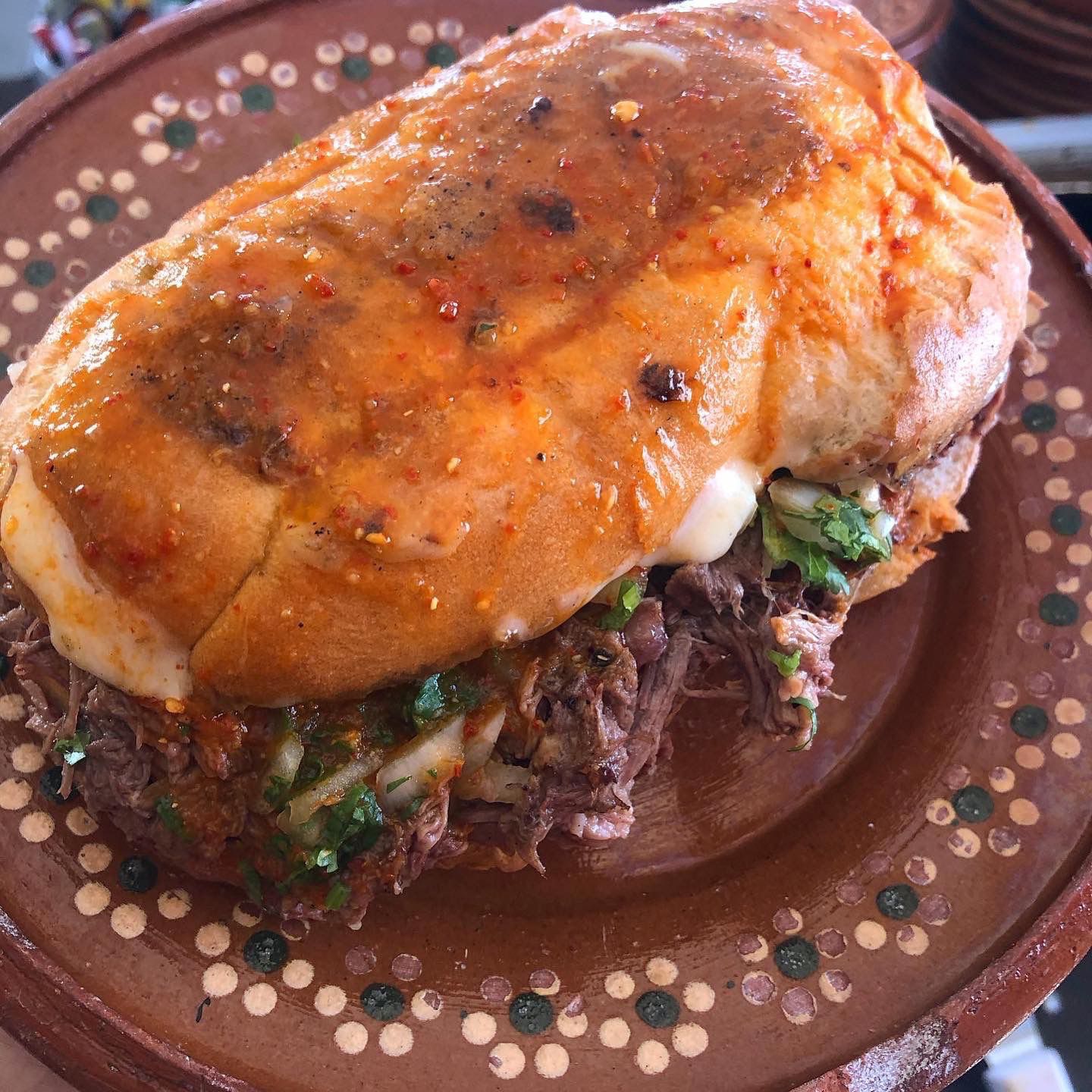 Pan telera con birria(carne puerco en chile colorado)
