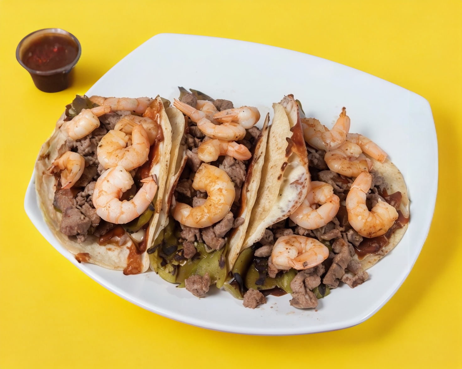 5 tacos de camarón con tocino, pimiento morrón, cebolla y queso.