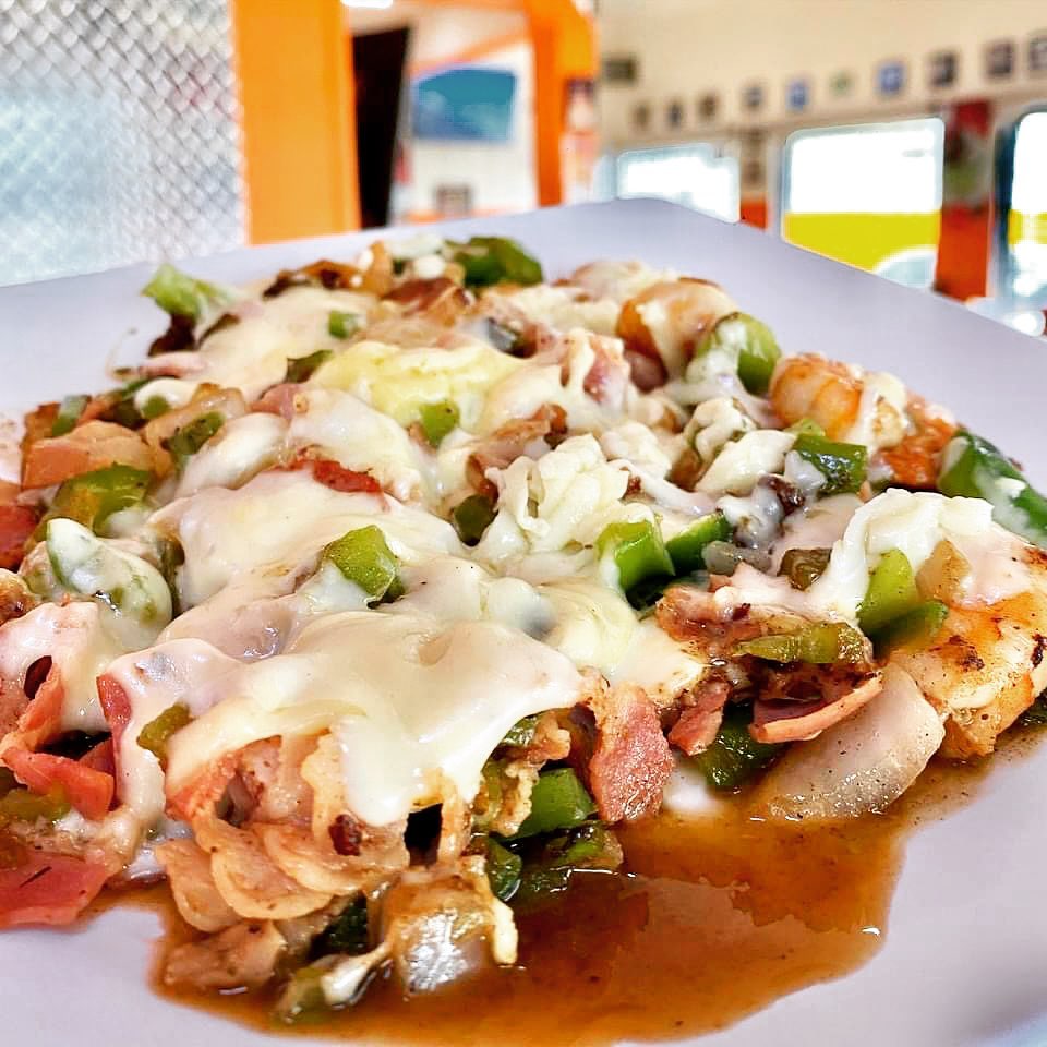 2 tortillas grandes de harina con queso, camarón, tocino, pimiento morrón y cebolla.