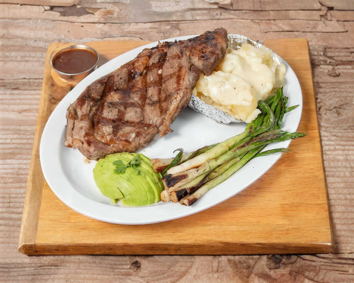 350 gr aproximado de corte rib eye añejado de sonora, asado, acompañado con aguacate, papa asada y cebollitas de rabo.