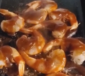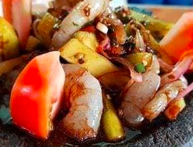 Camarones adobados en su cascara servidos sobre cama de pepino y cebolla a la mexicana.