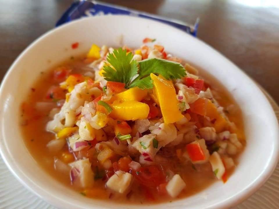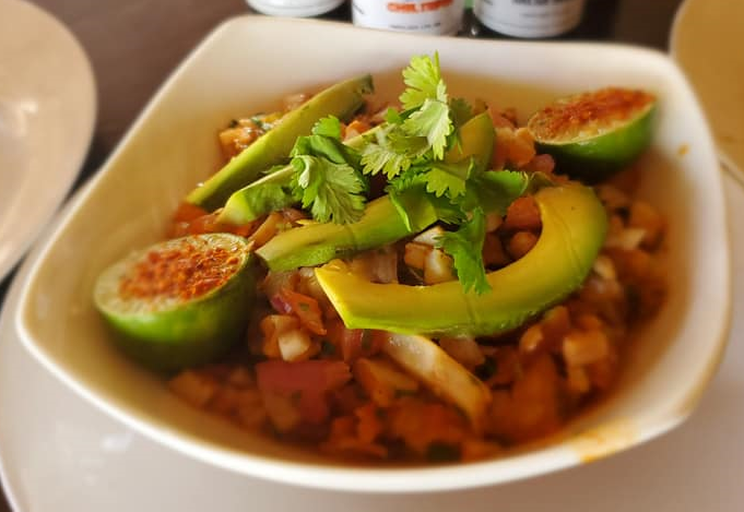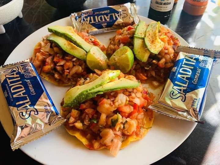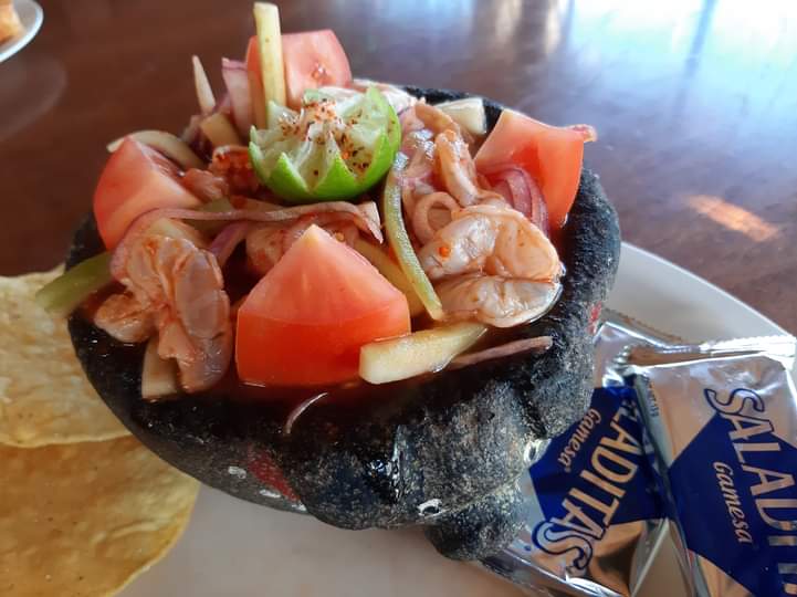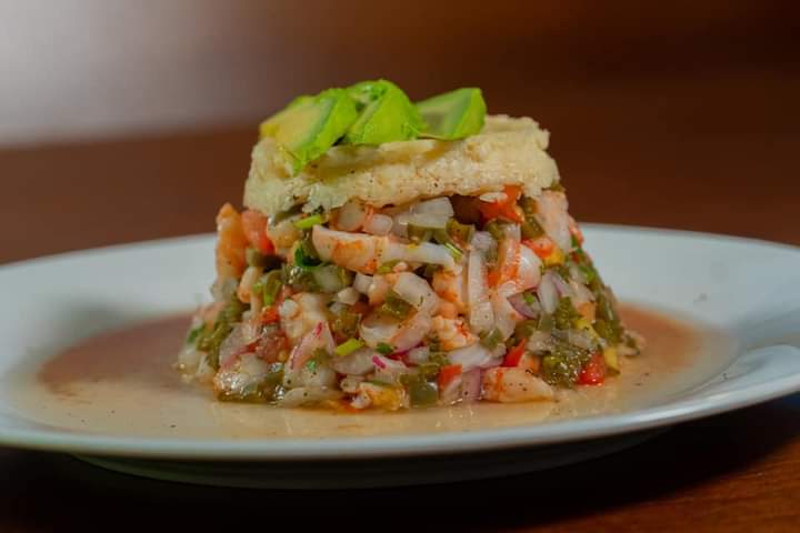 Camarón desnaturalizado en limón, cebolla morada, pepino y salsa espanta suegra.