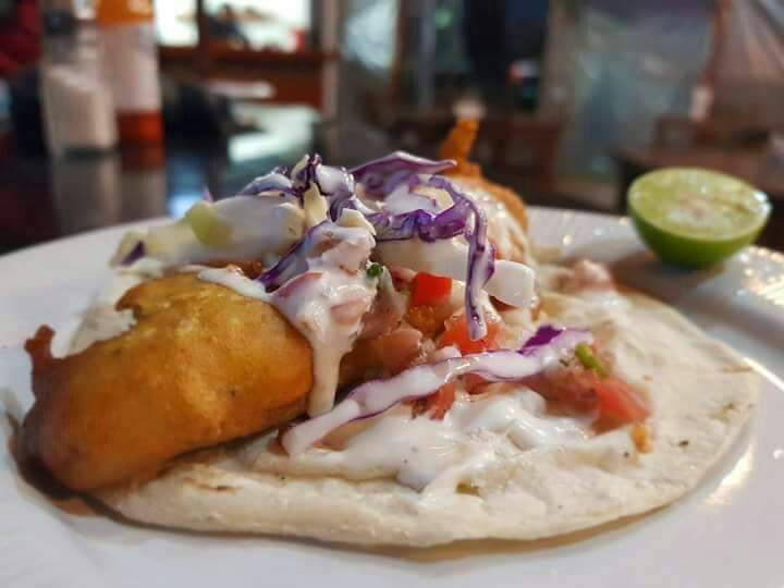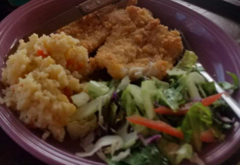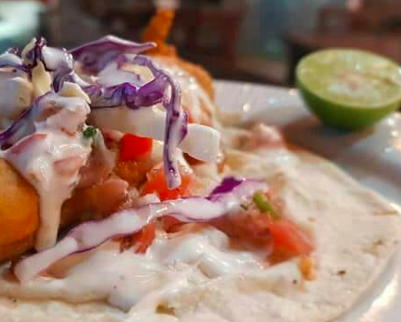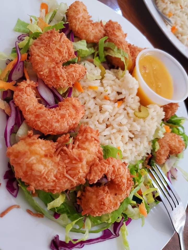 Camarones empanizados en coco rayado, acompañados de ensalada verde y arroz blanco y salsa mango-habanero.