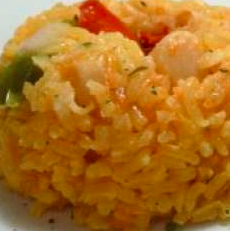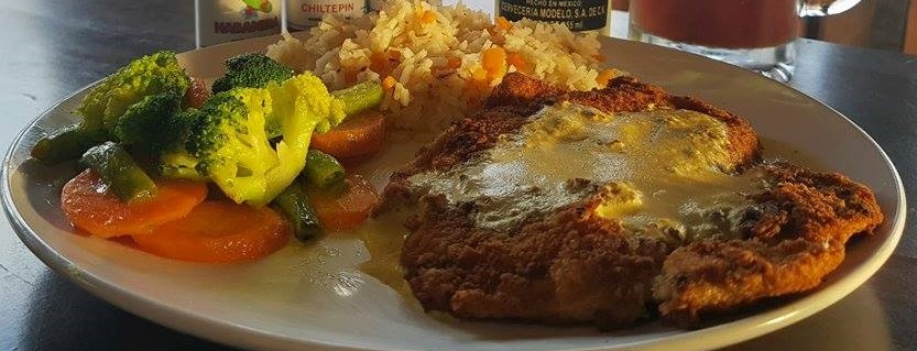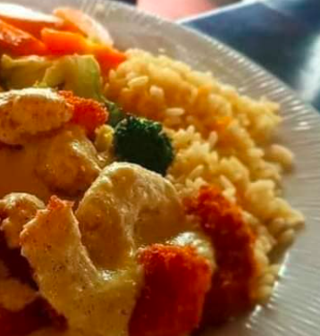 Camarones empanizados salseados en crema de chilaca y vegetales salteados en mantequilla y arroz blanco.