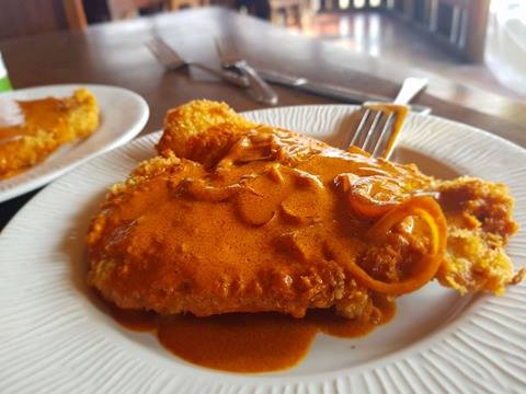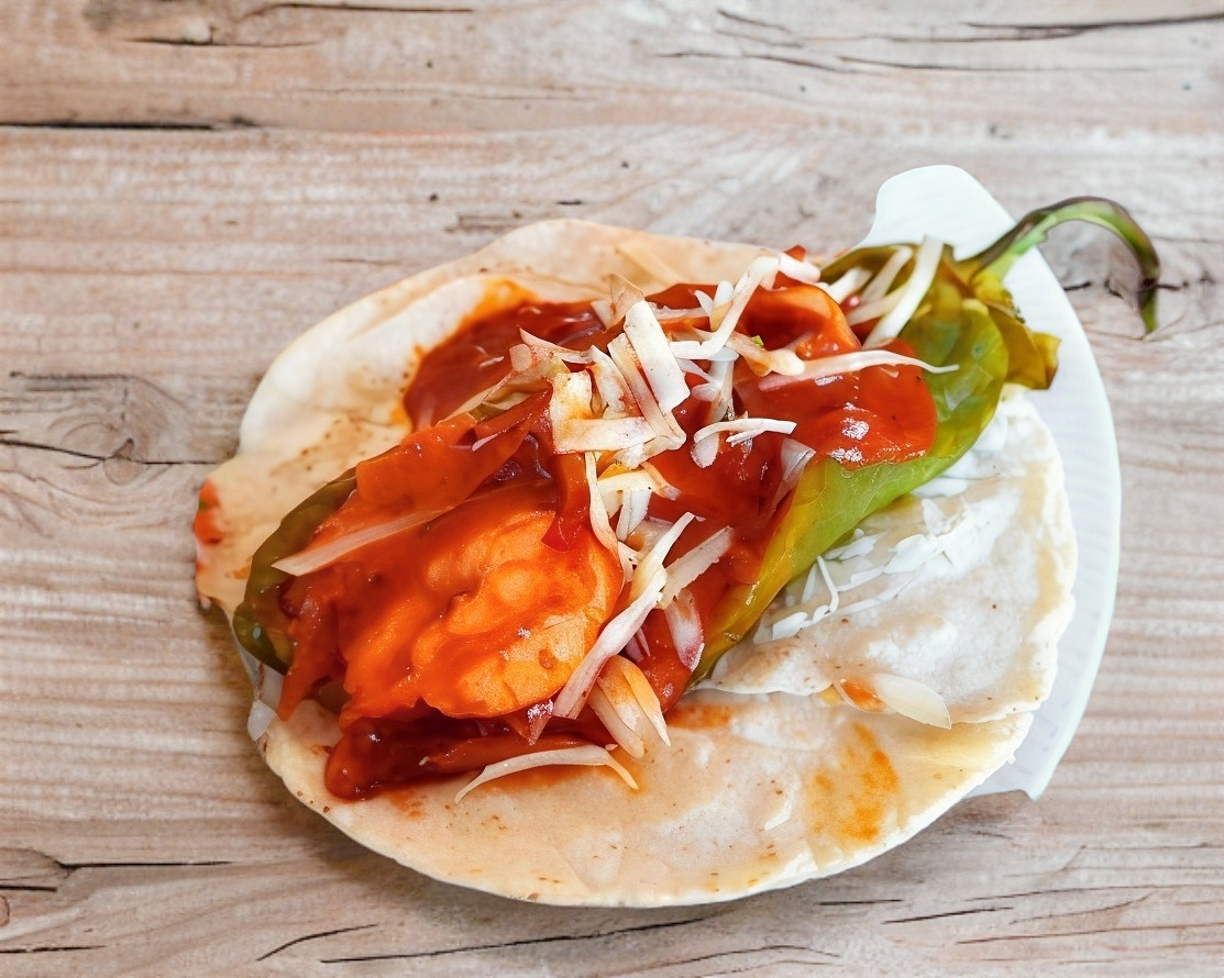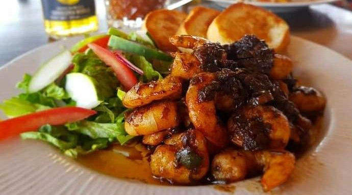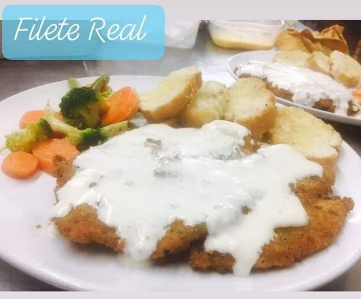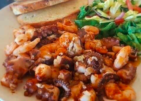 Camarones empanizados salseados en nuestra salsa de crema de 4 quesos acompañados de vegetales salteados y pan con mantequilla.