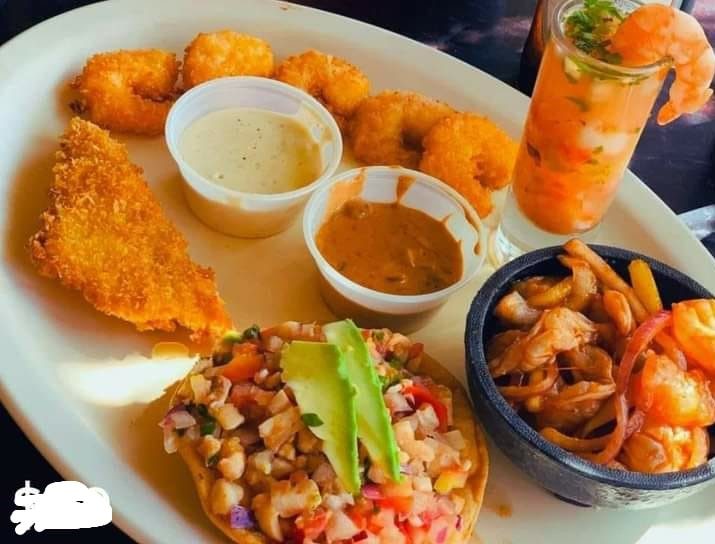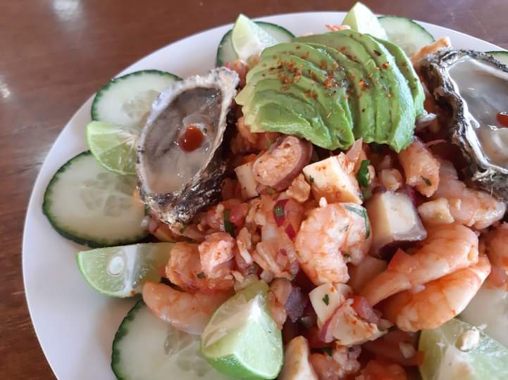 Mix de ceviche de pescado, camarón y pulpo, camarón cocido, ostiones y aguacate.