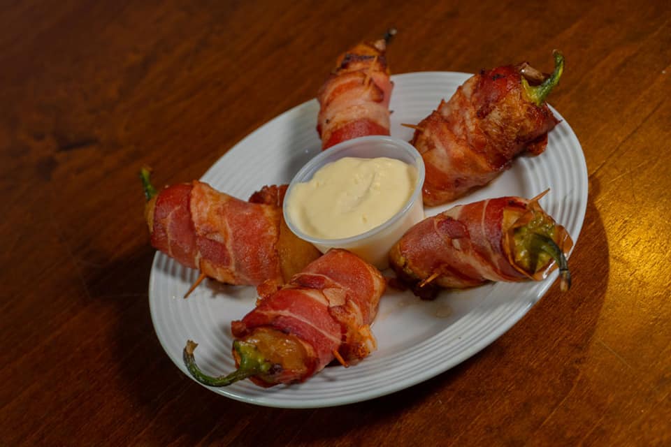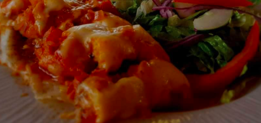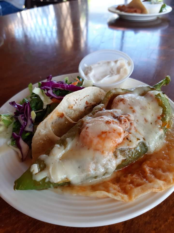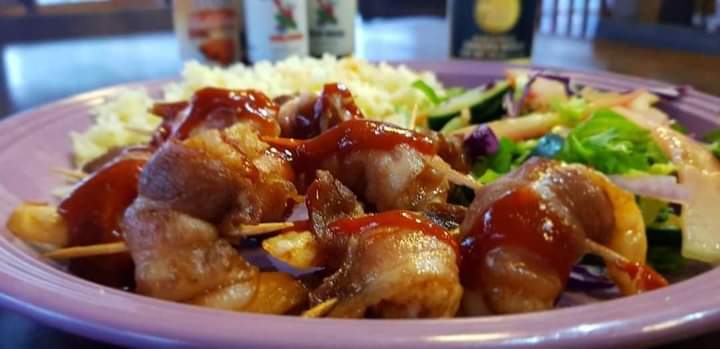 Camarones rellenos de queso ranchero enrollados en tocino salseados con nuestra salsa de la casa , ensalada verde y arroz blanco.