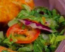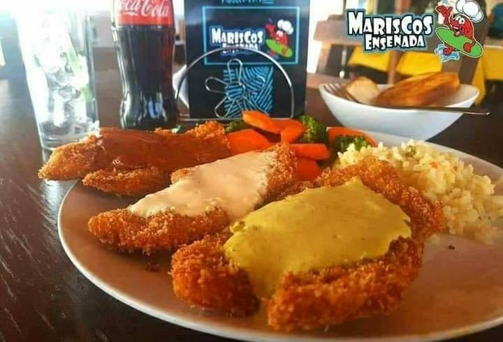 Camarones empanizados acompañados de arroz blanco, ensalada verde pídelos con 2 cremas para dipear (chipotle, California).