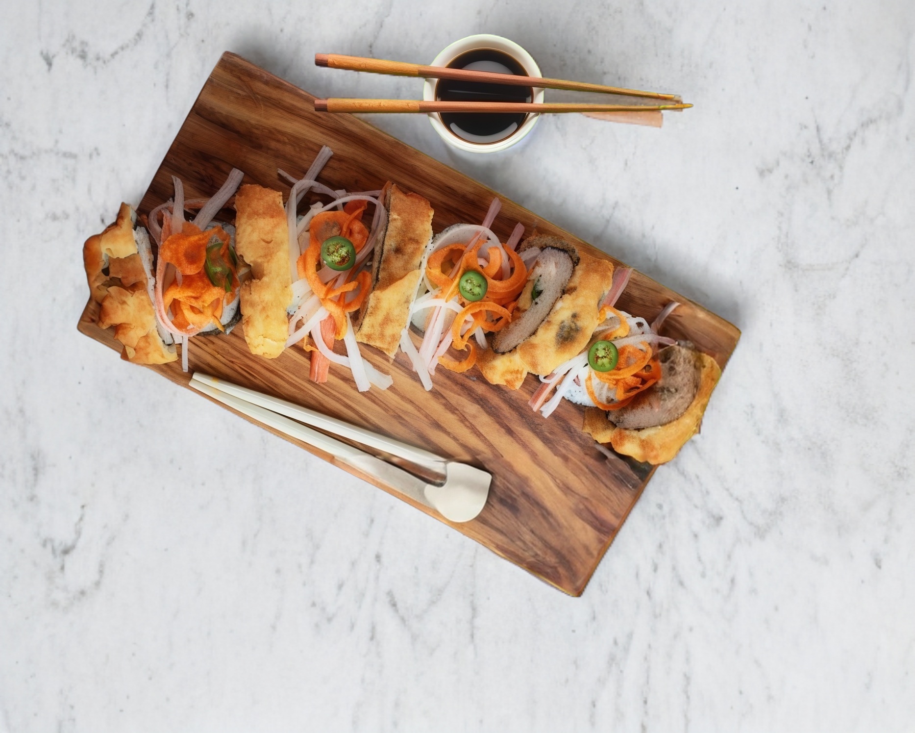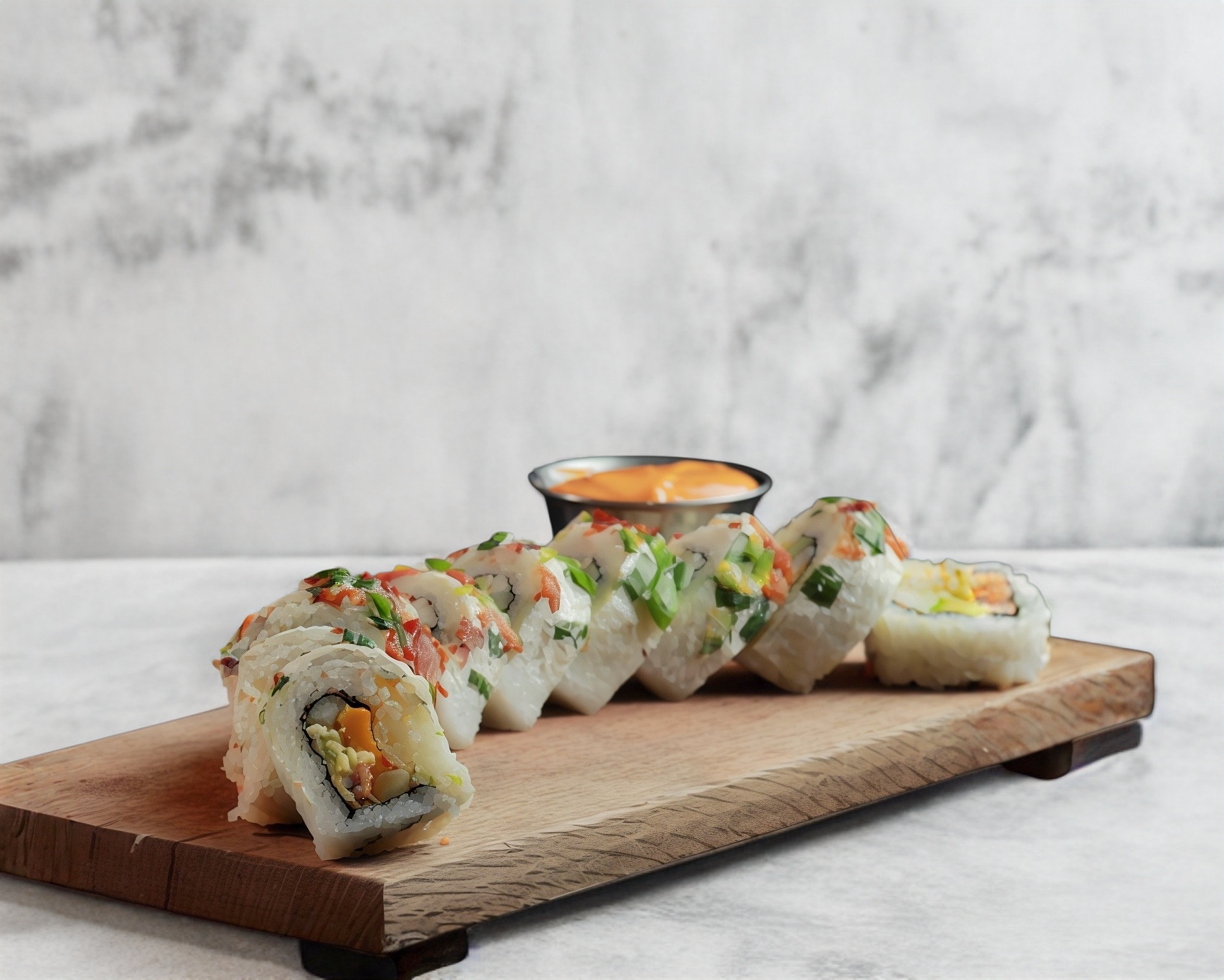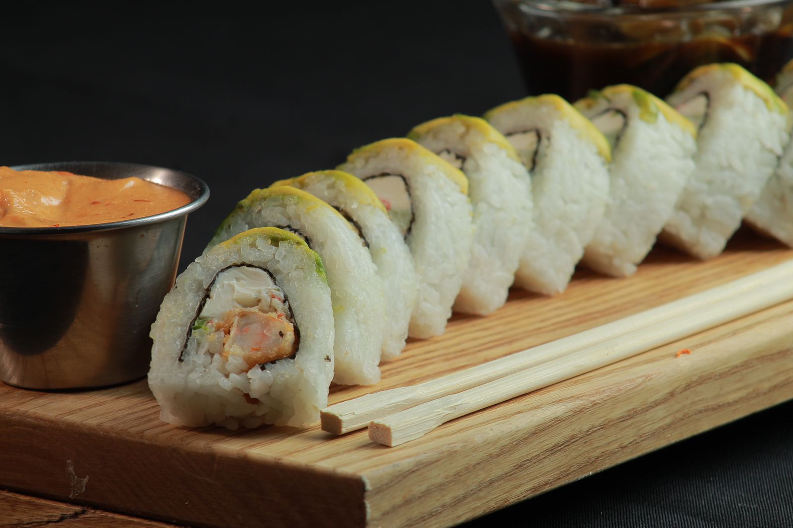 Por dentro, sin alga, aguacate, queso crema, cebollín, toreados y pollo. Por fuera queso gratinado, arrachera y tocino.