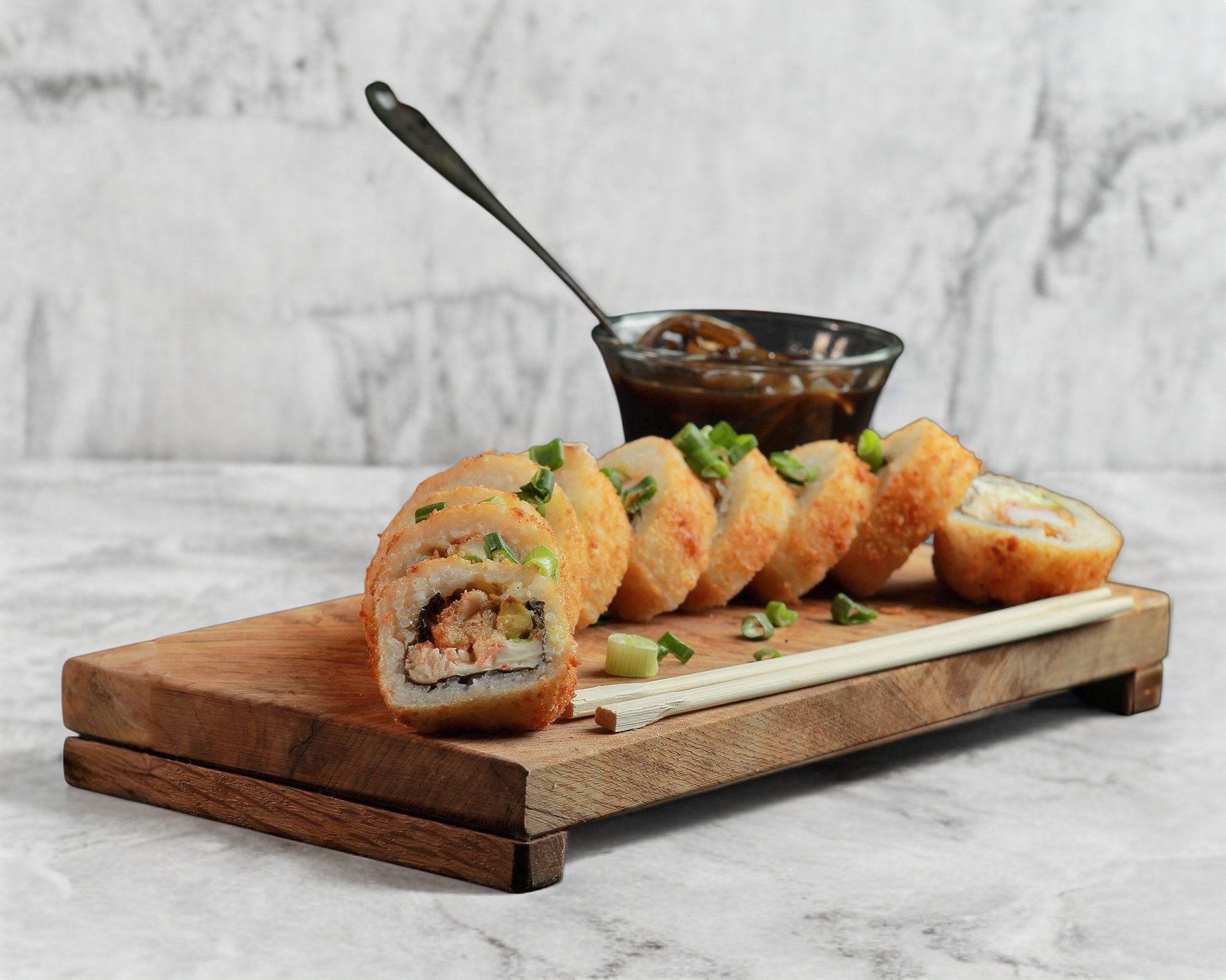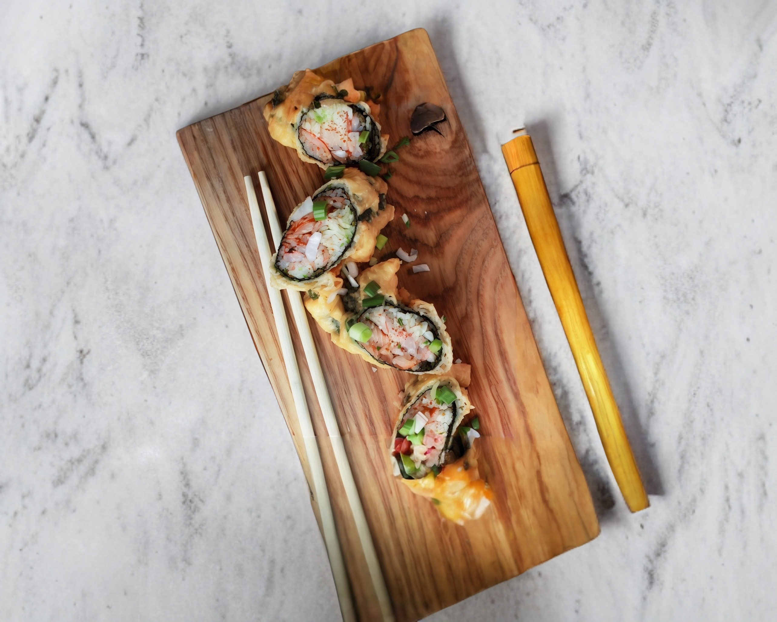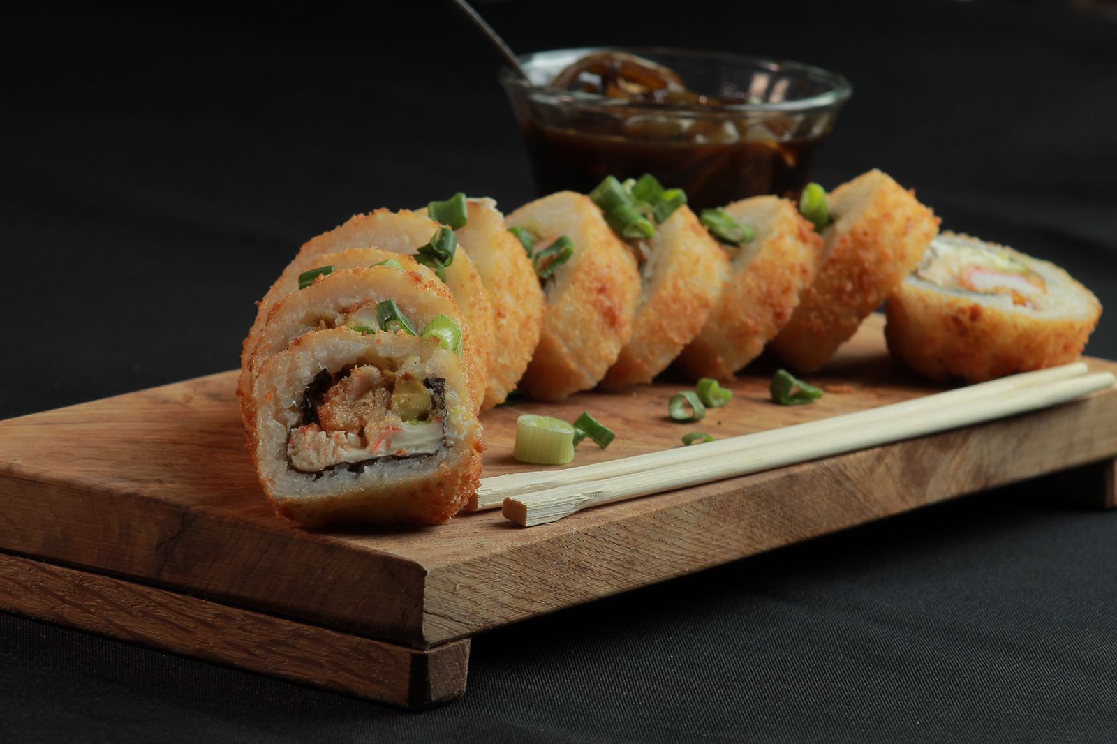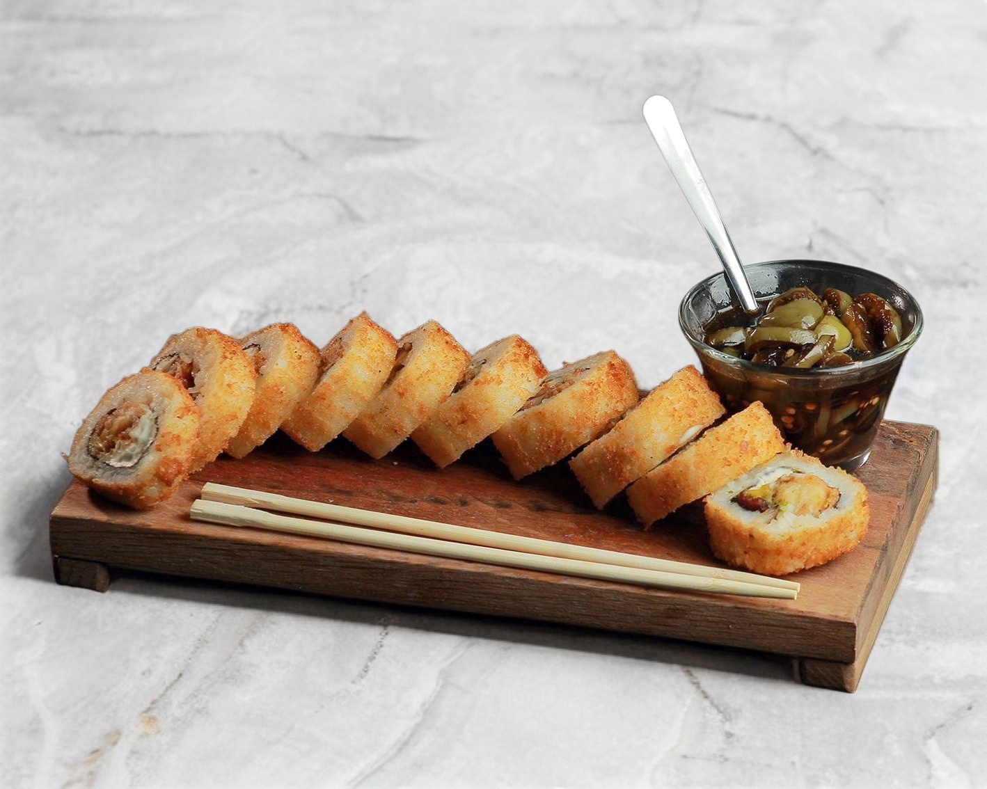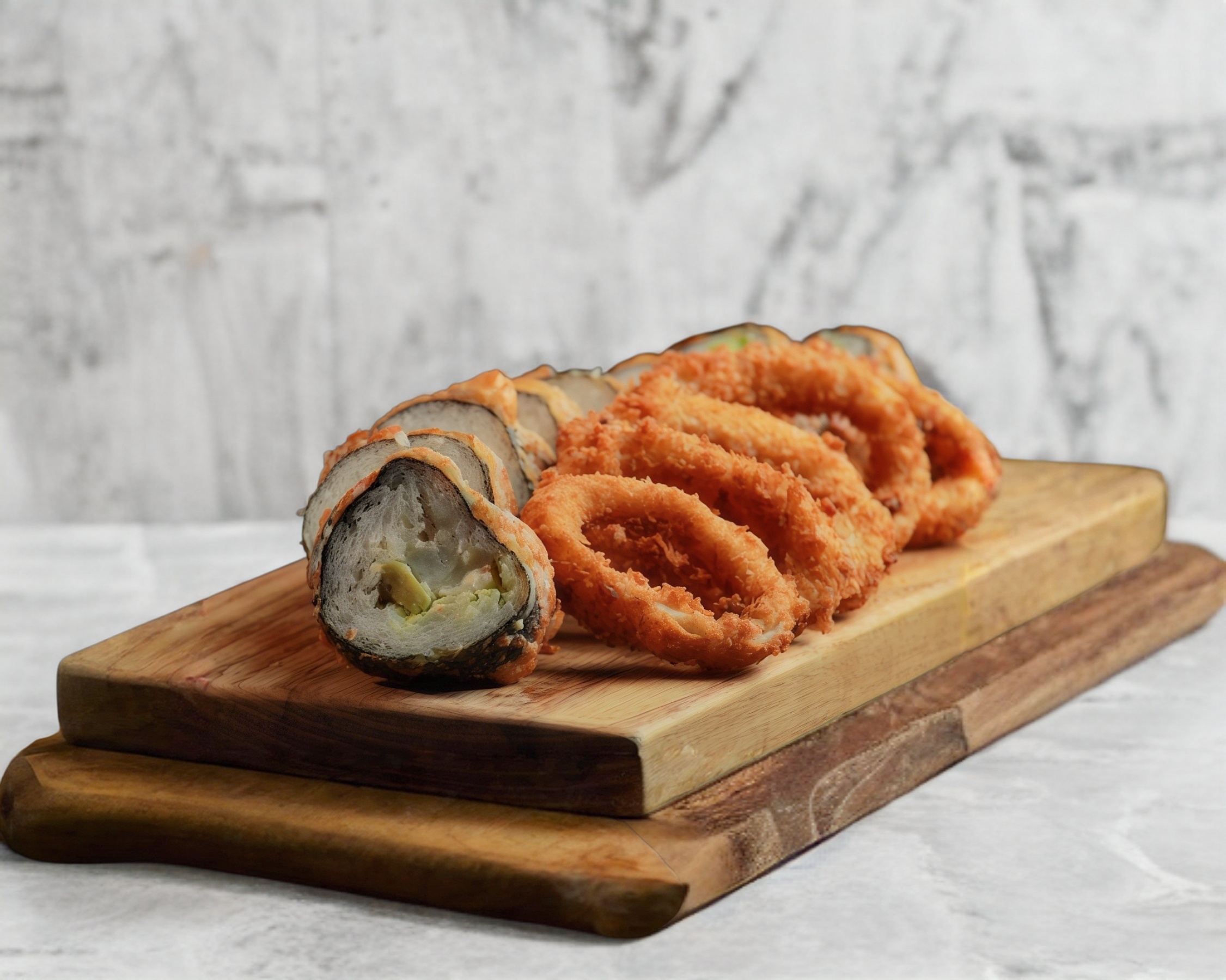 Surimi empanizado, queso crema, aguacate, pasta tampico y cebollín por dentro.