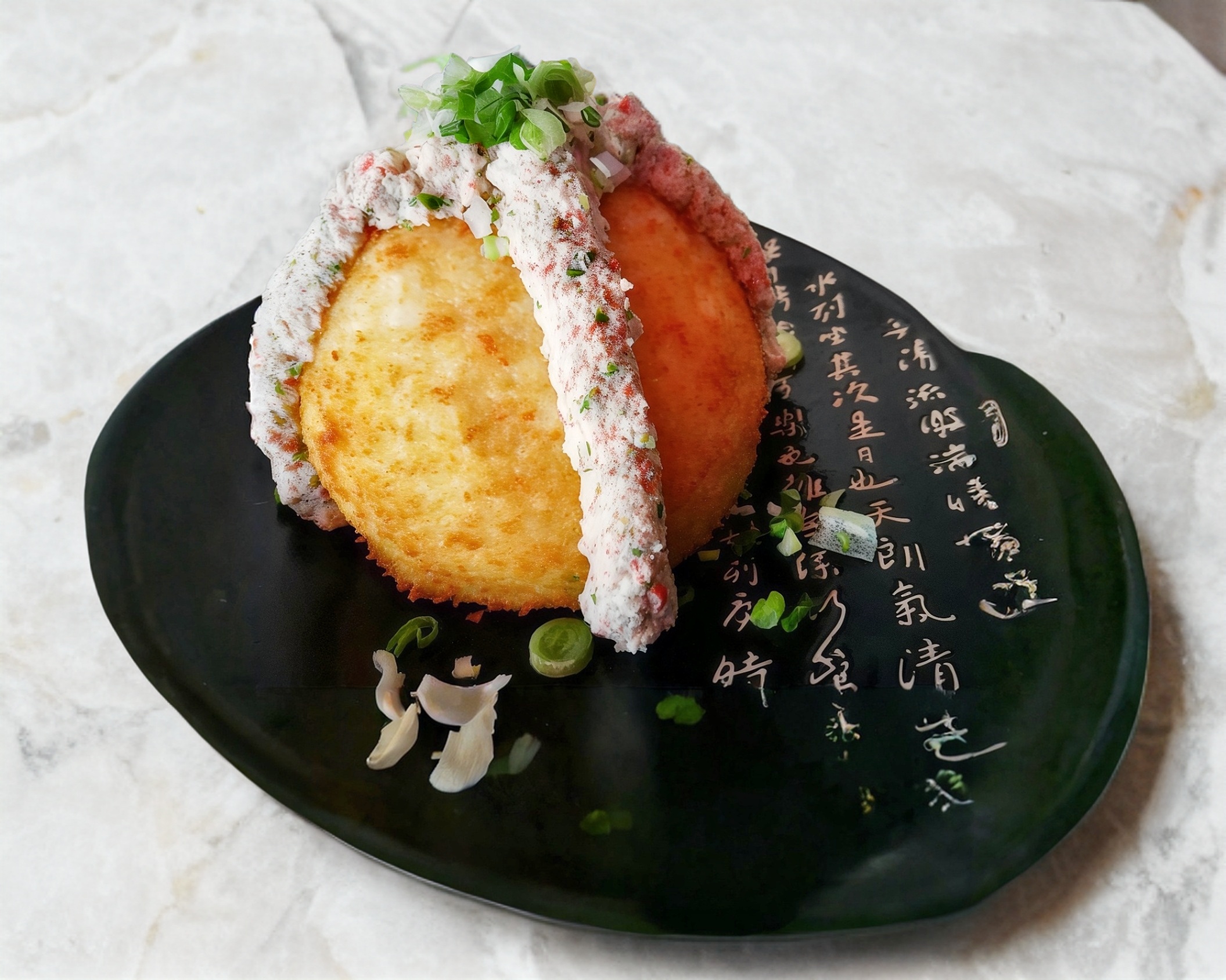 Pequeña bolita de arroz empanizada, rellena de aguacate y pollo.