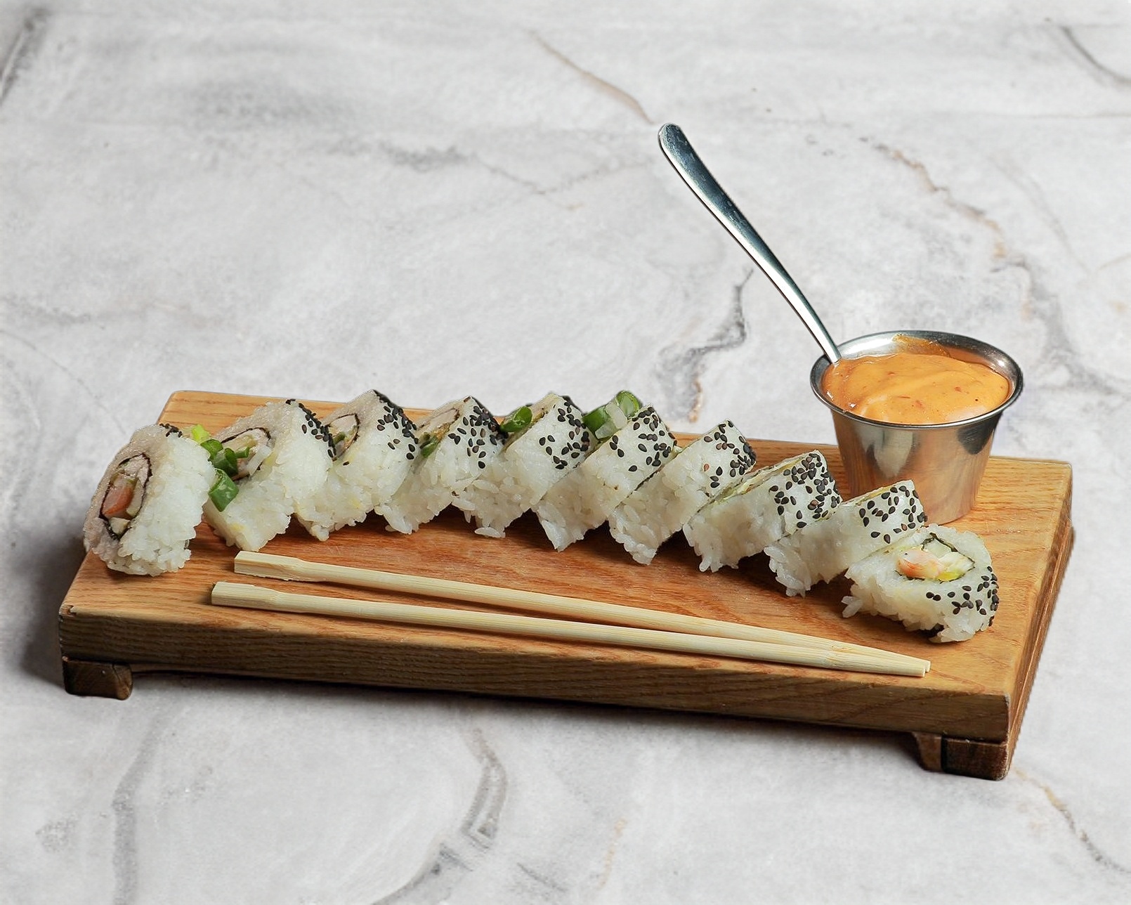 Aguacate, pepino, queso crema y camarón por dentro, con ajonjolí negro por fuera.