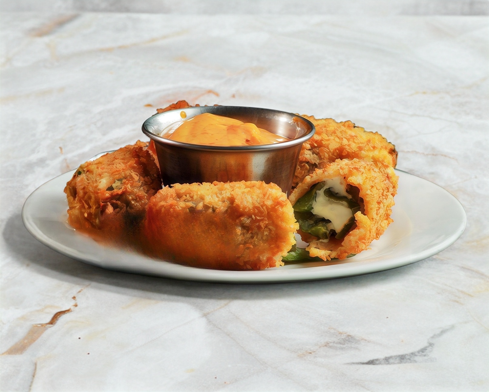 3 Chiles jalapeños empanizados, rellenos de queso crema.