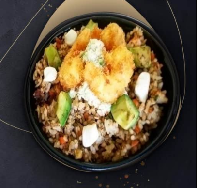 Arroz frito preparado con verduras, pollo, res y camarón, aguacate, queso crema, pasta tampico y topping de camarón empanizado.