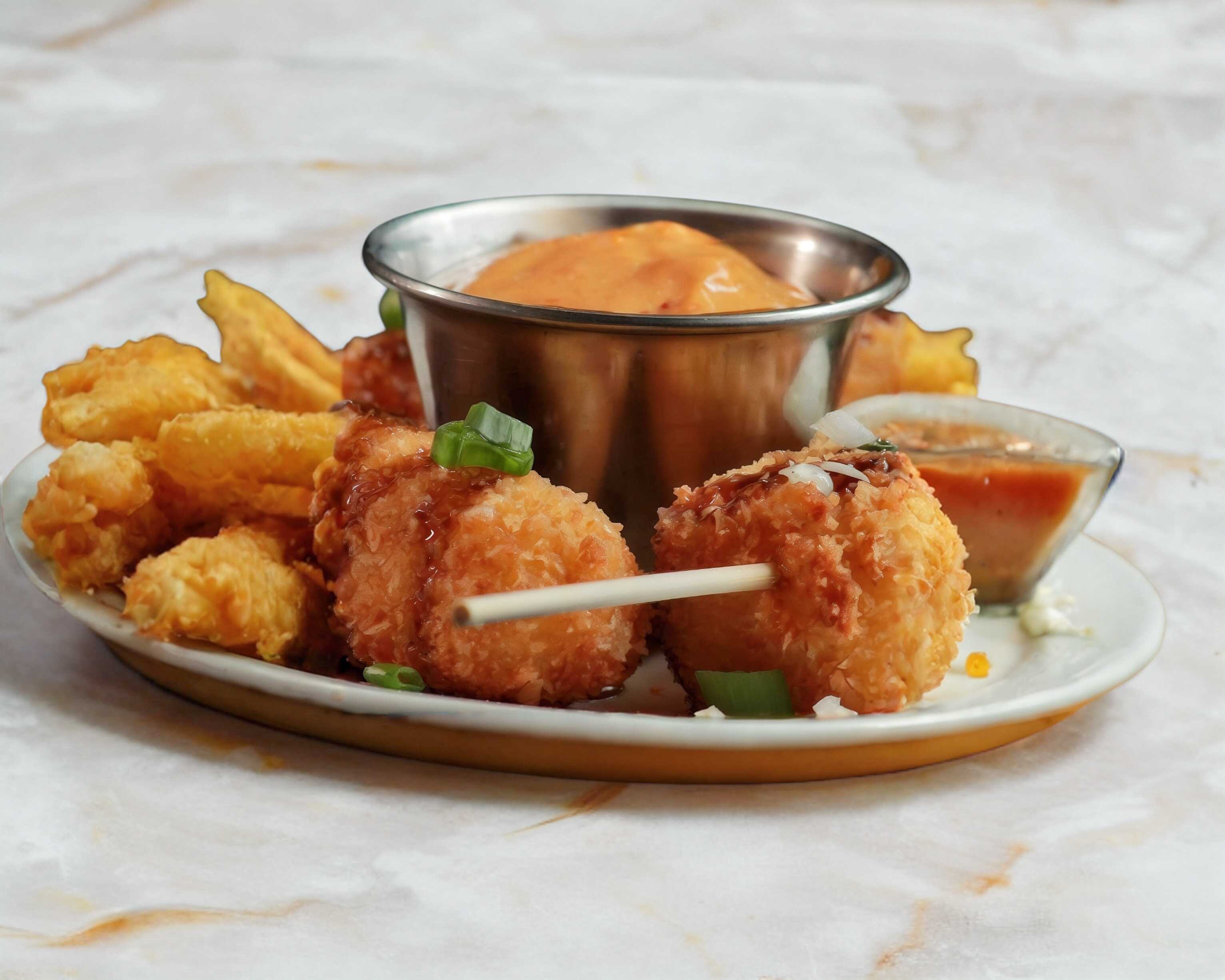3 Brochetas de camarón relleno con queso crema, empanizadas, bañadas con salsa teriyaki.