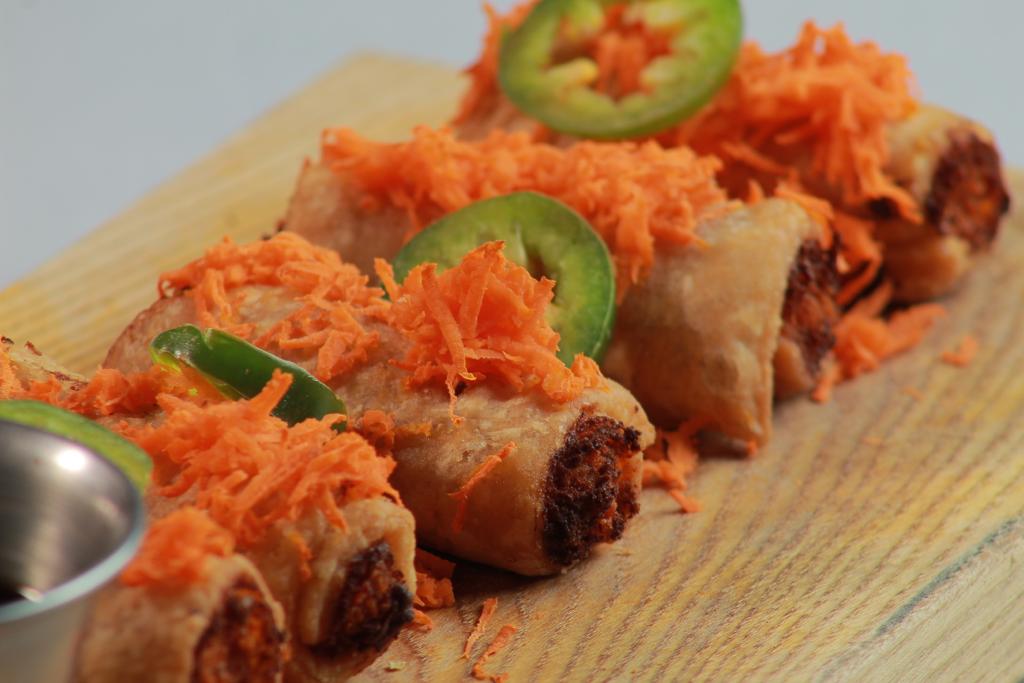 5 Rollitos de hojaldre, rellenos de pasta de cangrejo al chipotle, acompañados con salsa de soya.