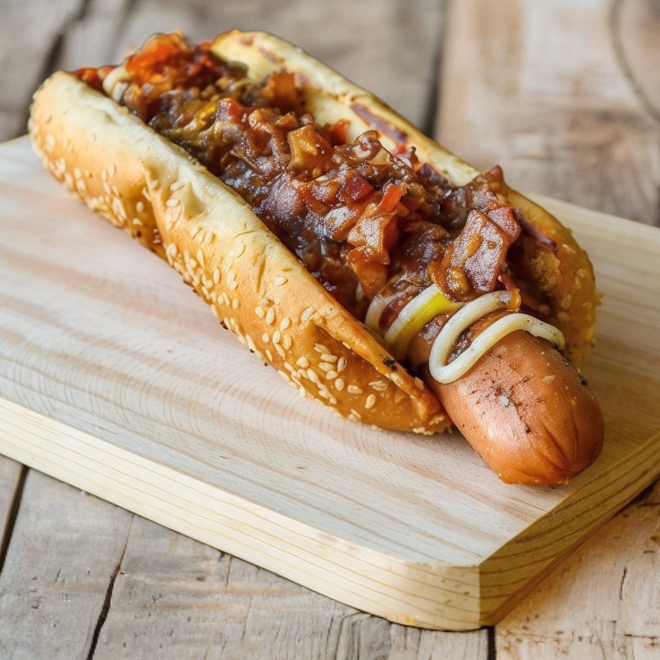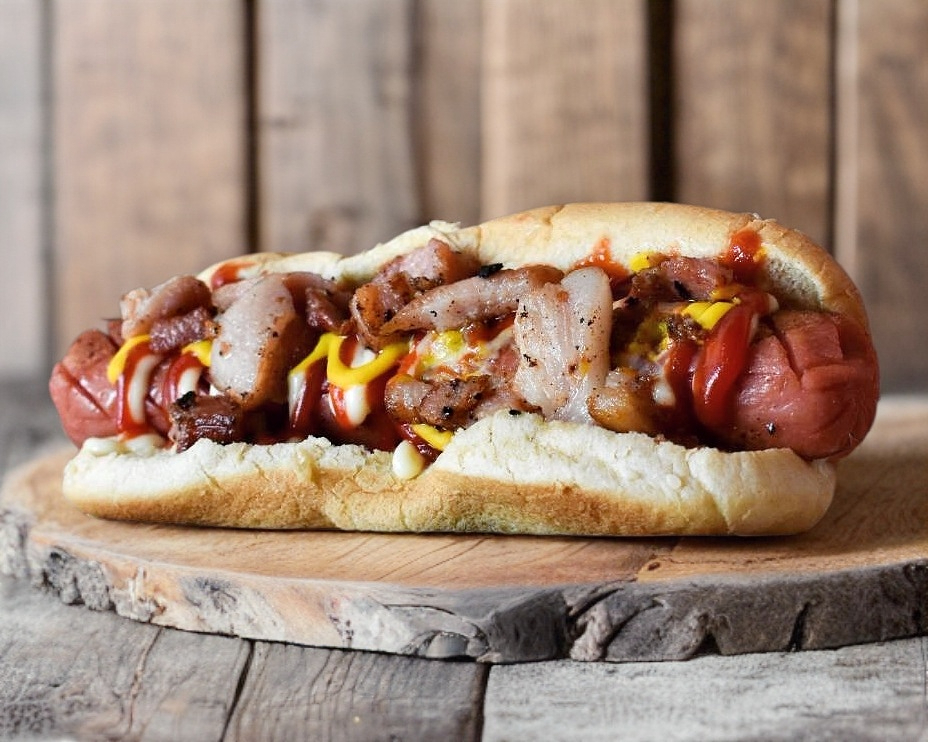 Dogo de 25 cm con una salchicha mixta de carne de cerdo en pan jumbo con nuestra mermelada de tocino y un aderezo a elegir.
