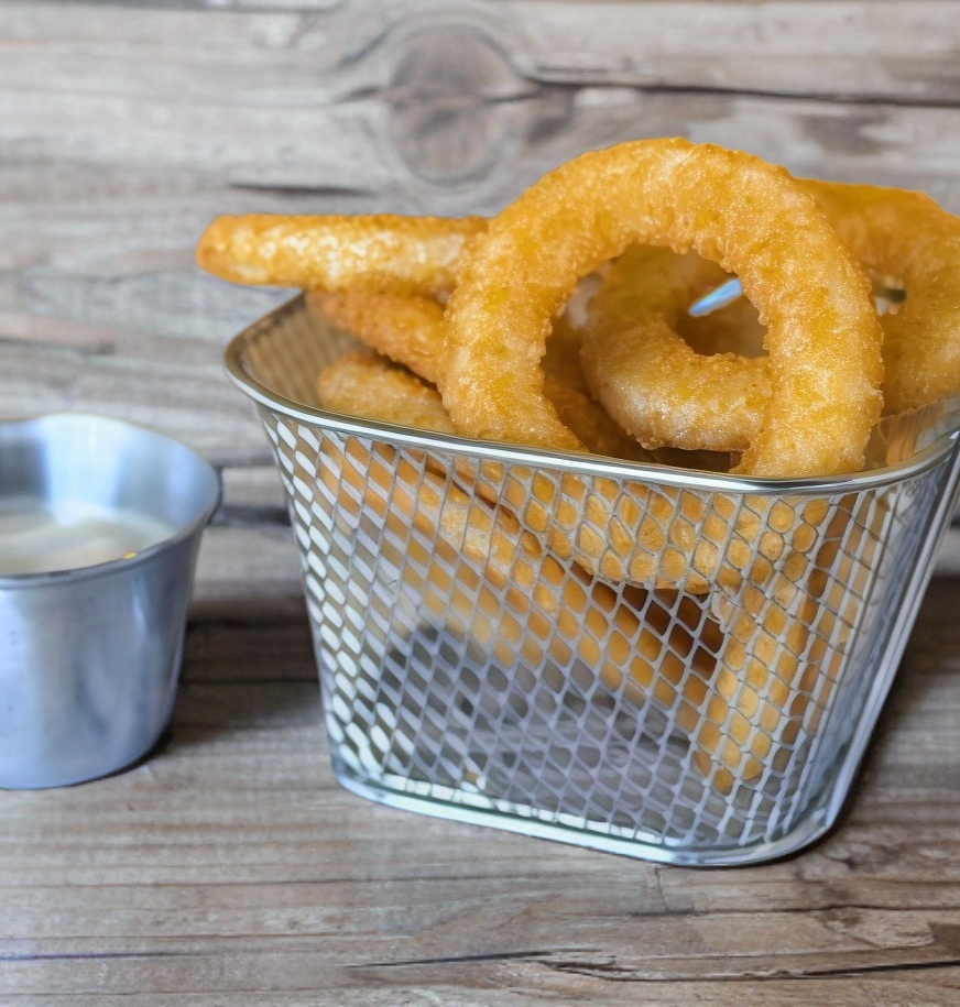 Deliciosos aros de cebolla, acompañados con aderezo ranch.