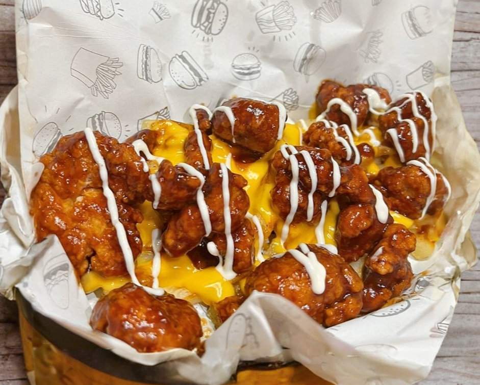 250 gr de pollo bañados en tu salsa favorita con 200gr de papas francesas con queso amarillo