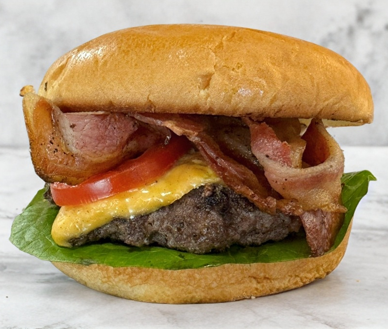 200 g de carne en pan Brioche con queso amarillo, nuestra mermelada de tocino, un aderezo a elegir y verdura*.