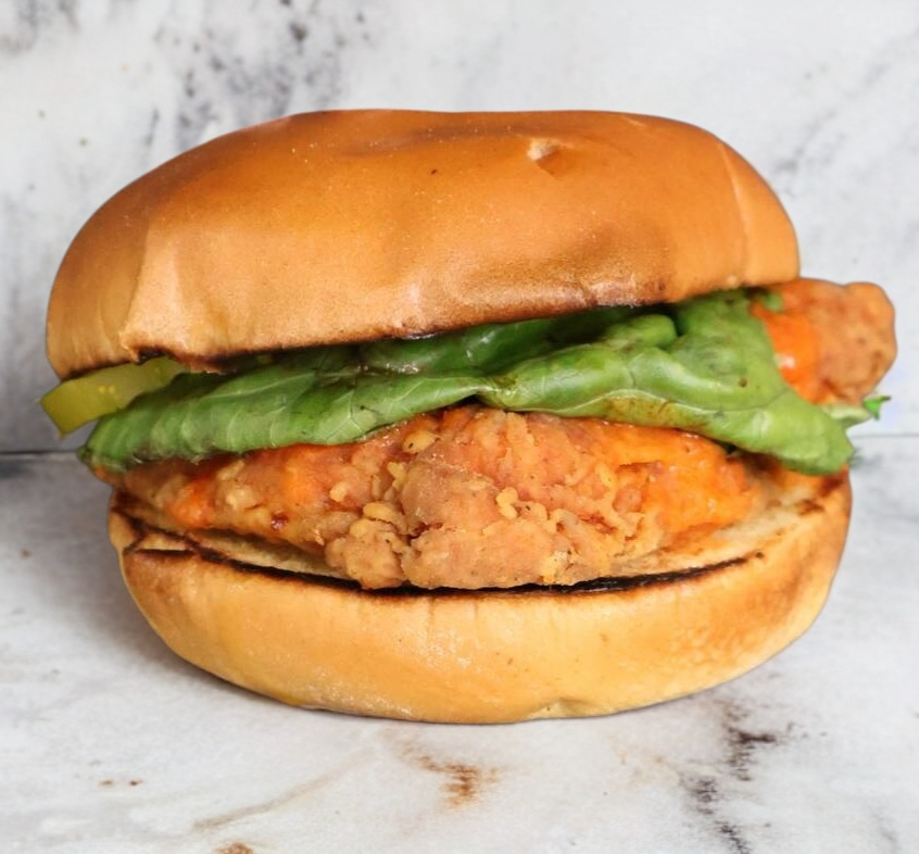 150 gr de pechuga 100% de pollo empanizada, con tu salsa favorita, pan Brioche, alioli, lechuga y pepinillos.