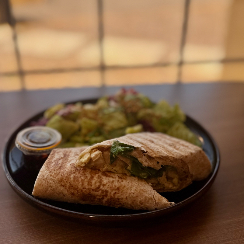 Tortilla de harina integral rellena de una deliciosa mezcla de pollo, queso, elote y espinaca.
