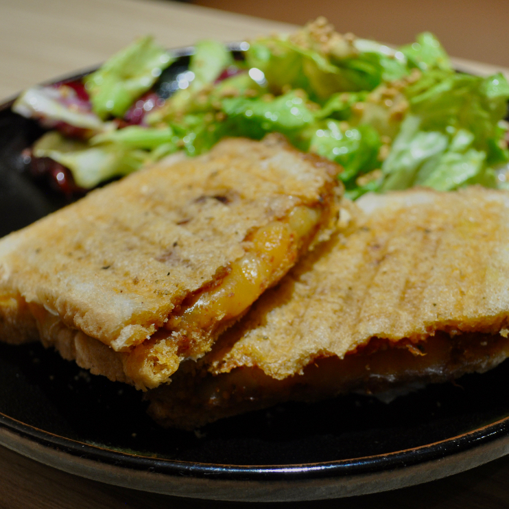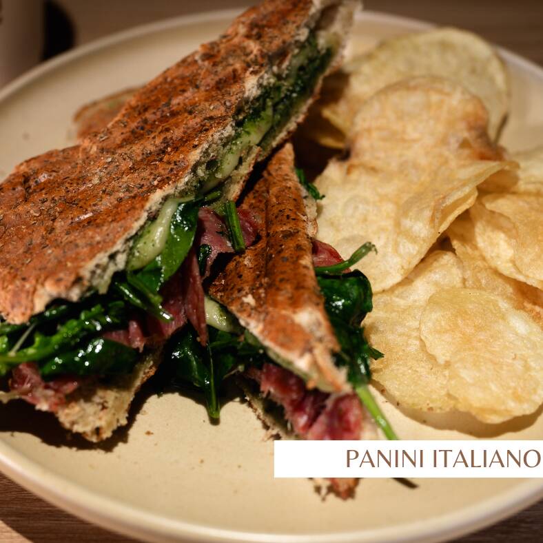 Pan ciabbatta, con aderezo de la casa, queso brie, jamon serrano, espinacas y cebolla caramelizada.