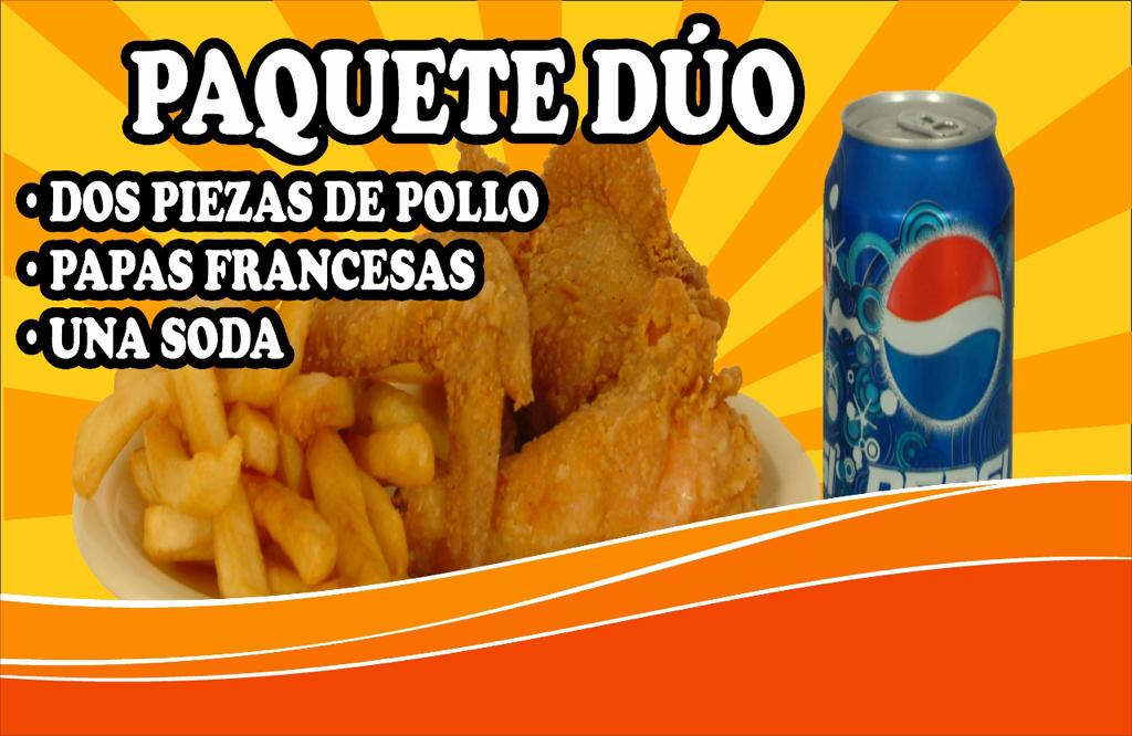 Dos piezas de pollo, papas a la francesa y una soda, incluye tortillas.