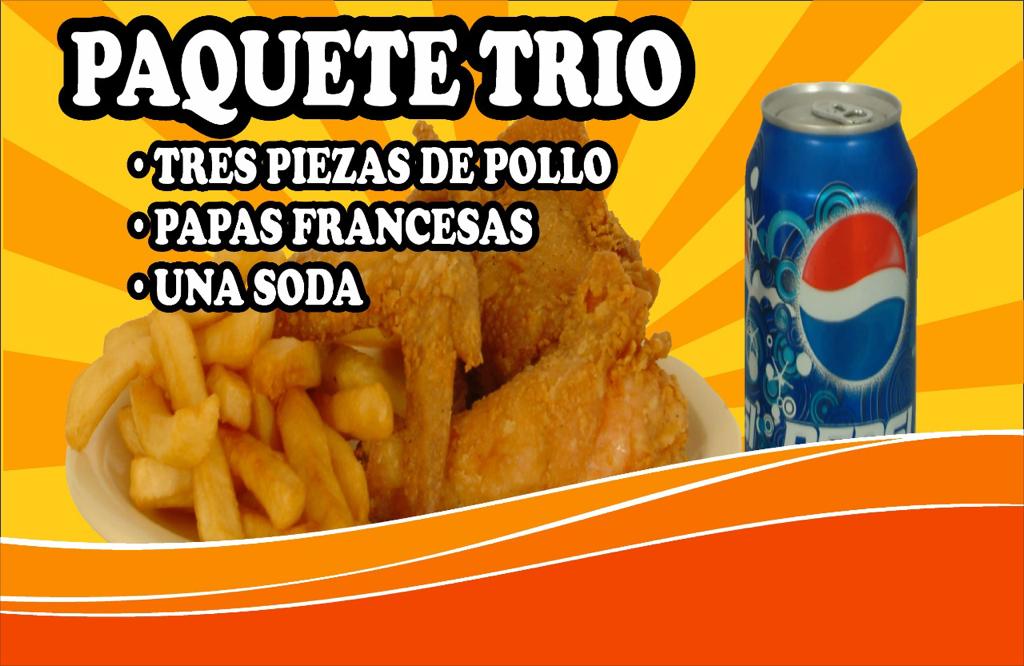Tres piezas de pollo, papas a la francesa y una soda incluye tortillas.