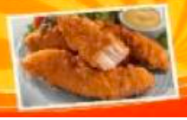 Orden de tiras de pechuga empanizada acompañadas de aderezo y una porción de ensalada.