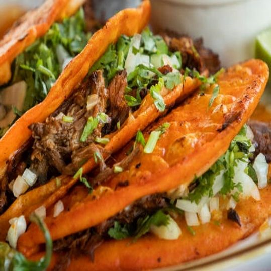 Tradicional montado de birria en tortilla de harina. Incluye consomé.