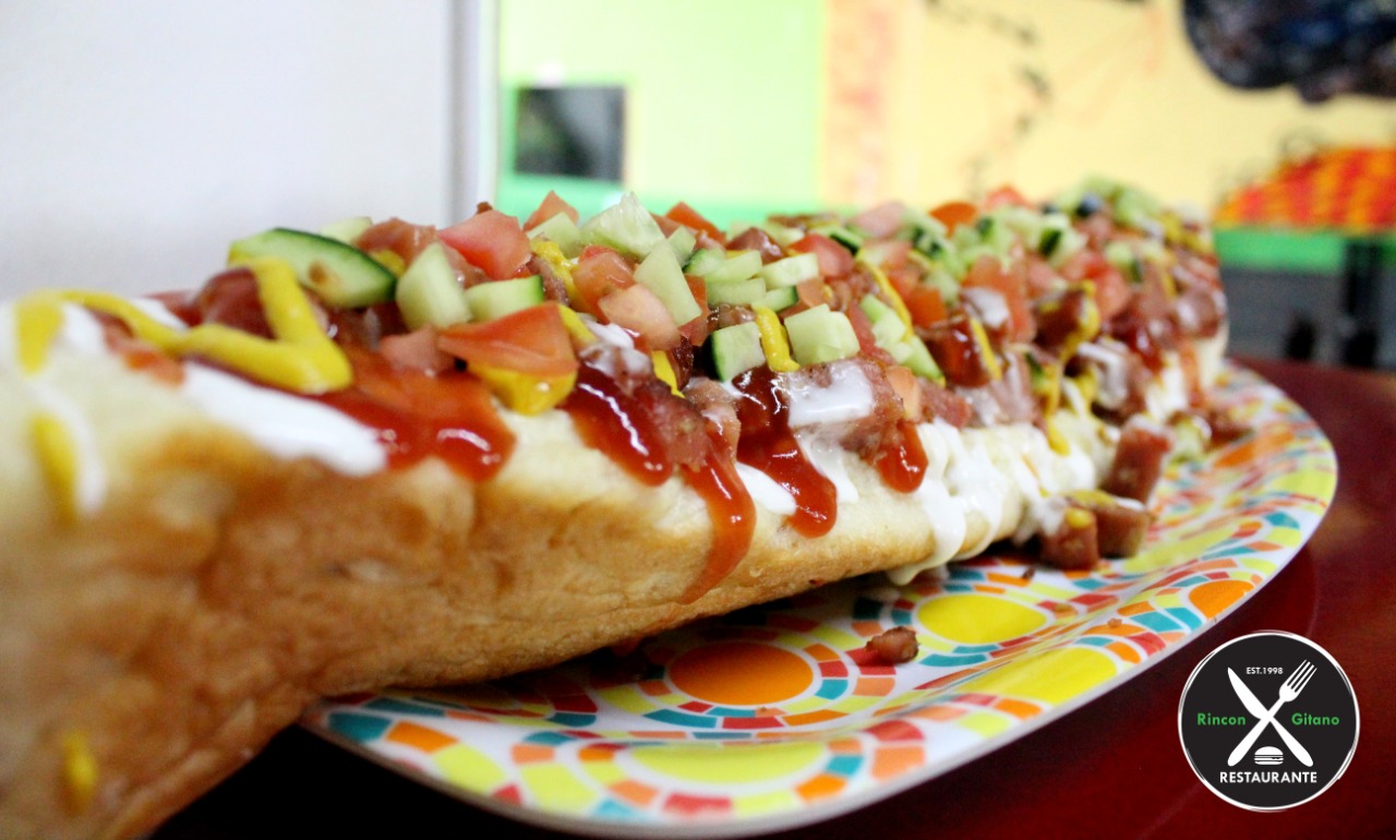 Dogo especial tamaño MEGA (50cm) con salchicha, relleno de jamón guisado con tocino y chorizo, pepino, tomate, cebolla, crema y aderezo