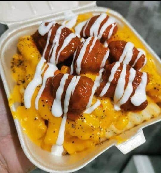 Papas fritas (250gr) bañadas en queso para nachos, coronadas con mini boneless (120gr) Acompañadas con curtidos.salsa favorita y rayados con ranch. Acompañados de curtidos o ranch