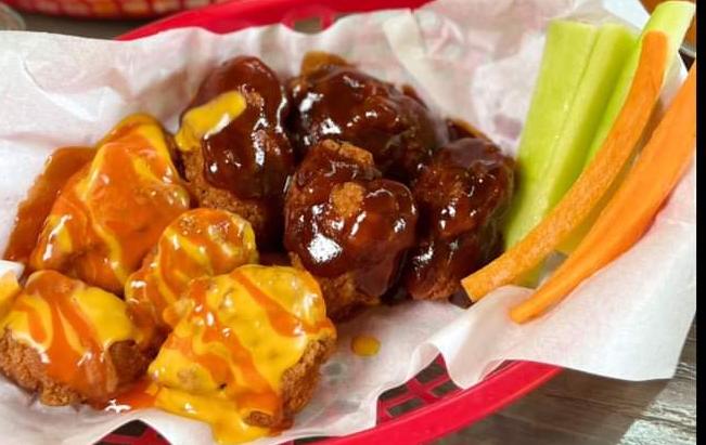 Bola de Arroz rellena con pollo, tocino, aguacate y queso Philadelphia, bañada con aderezo bufalo ranch y acompañada de tiras de zanahoria y pepino.