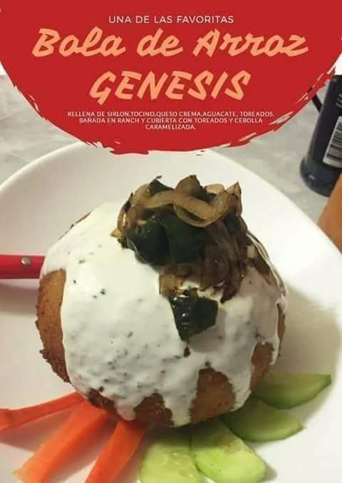 Bola de Arroz rellena con bistek, tocino, cebollita caramelizada, aguacate y queso Philadelphia, bañada con aderezo ranch, coronada con toreados, y acompañada de tiras de zanahoria y pepino.