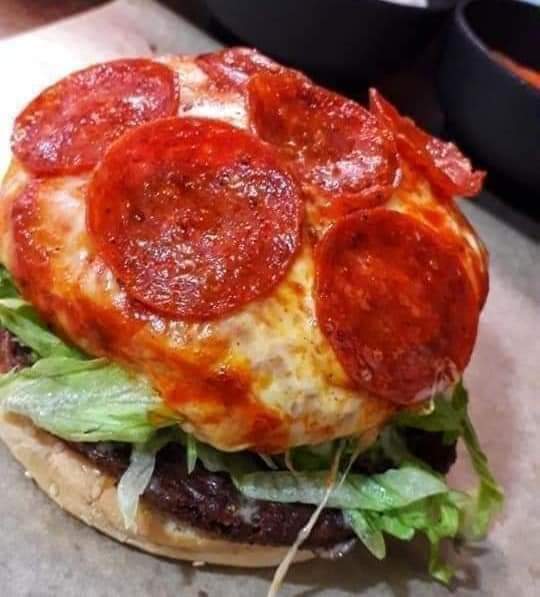 Burger con carne de arrachera, aderezos y verdura. Coronada con una estilo pizza.