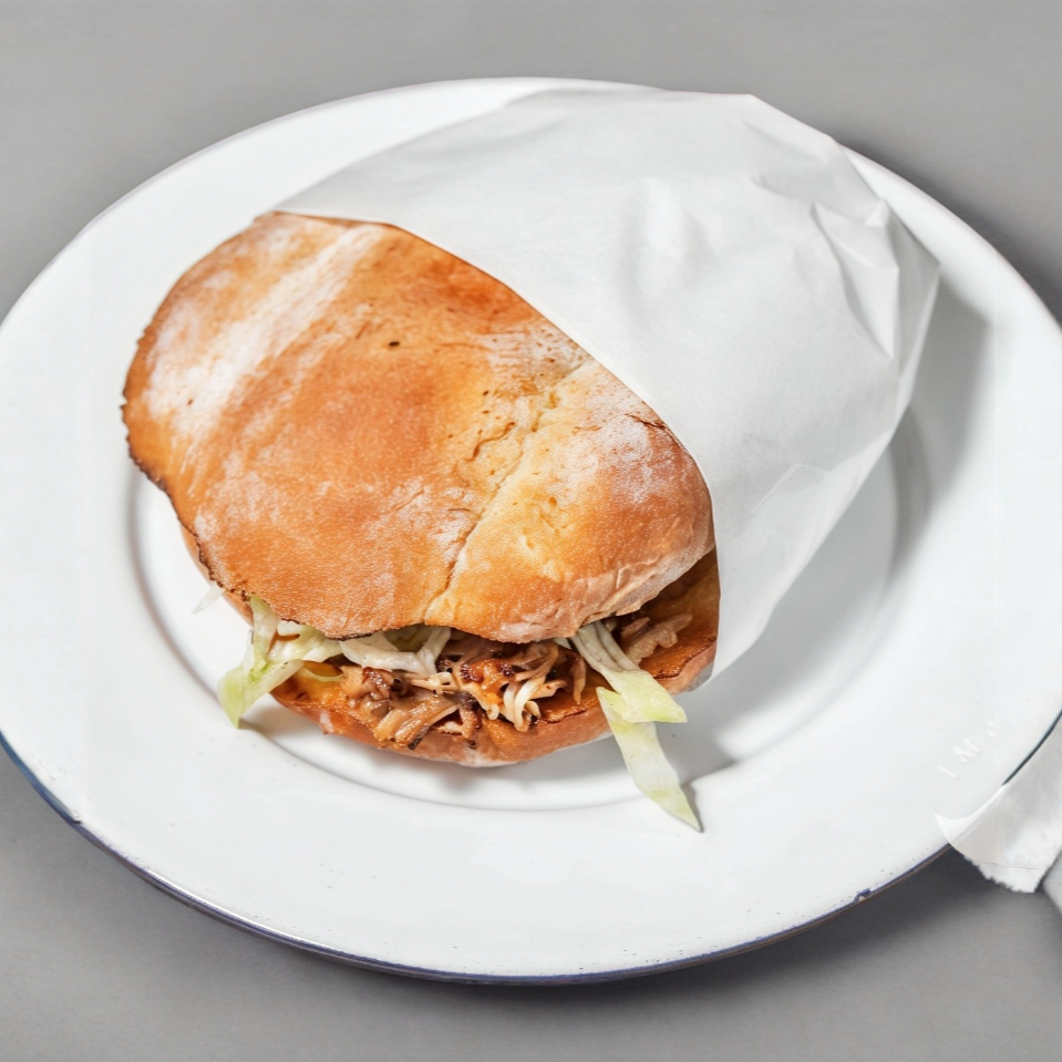Pan de telera dorado en mantequilla con Pastor a la plancha,queso asadero, aderezo, lechuga y tomate.
