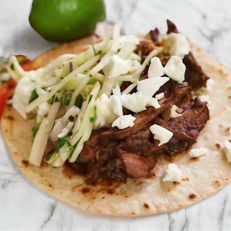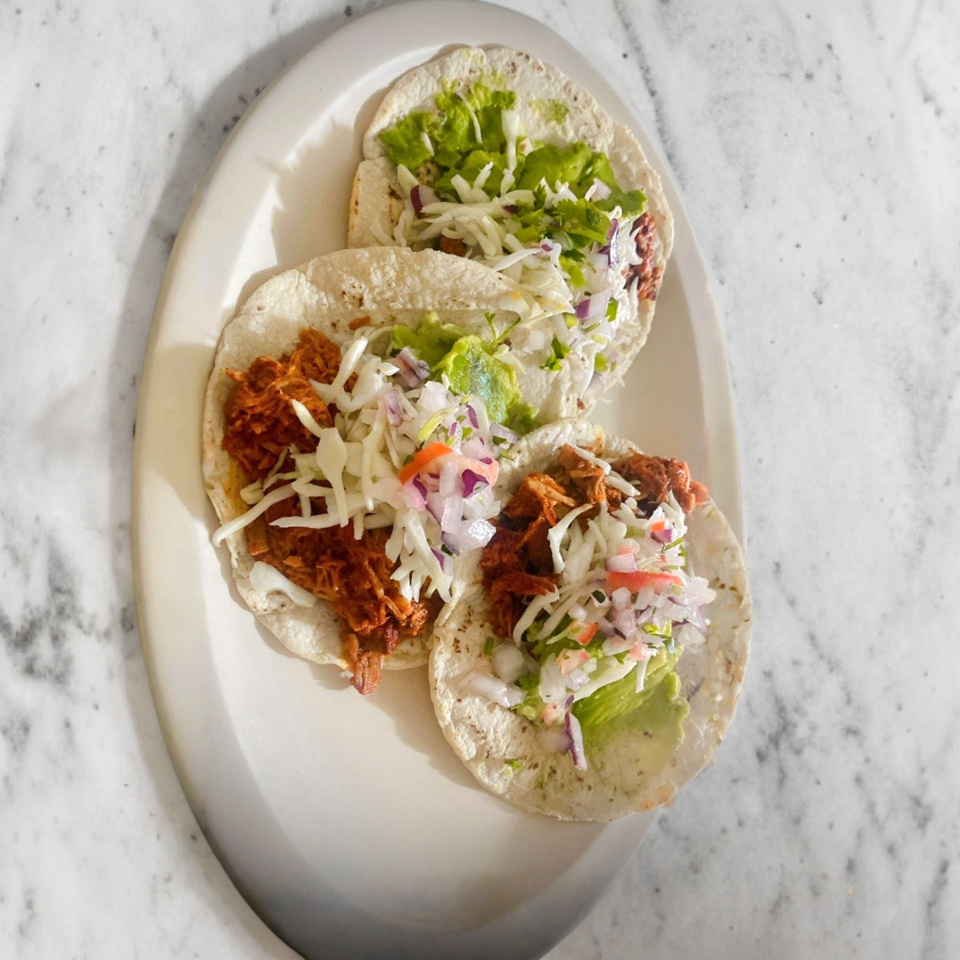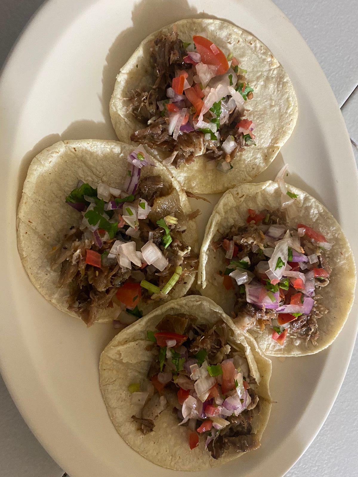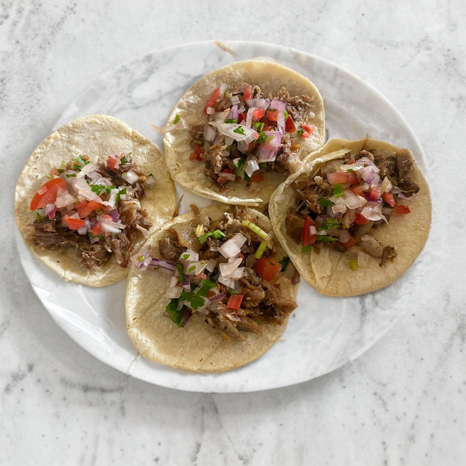 4 tacos en tortilla de maíz chica. Con pico de gallo.