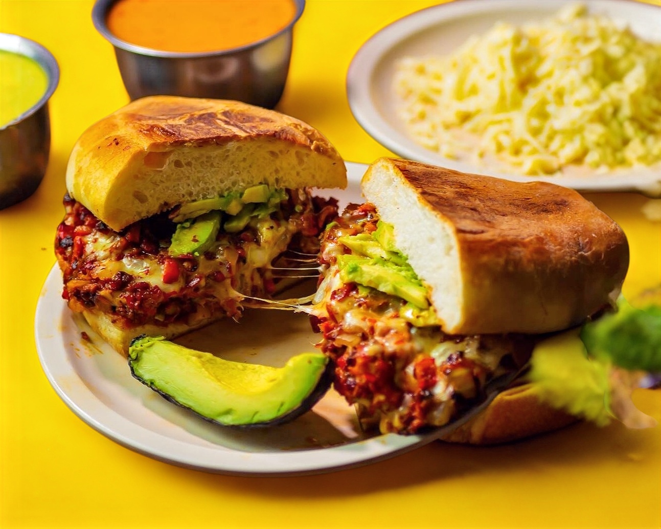 TORTILLA DE HARINA, PASTOR, CHULETA, AGUACATE Y QUESO.