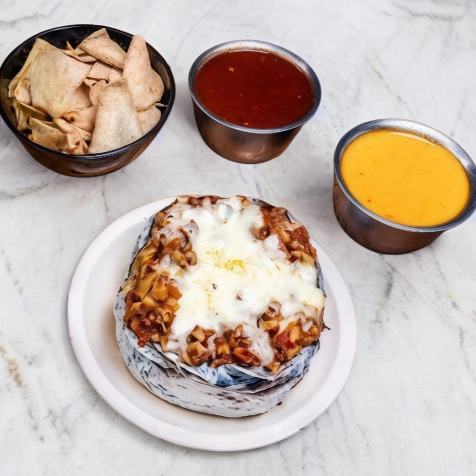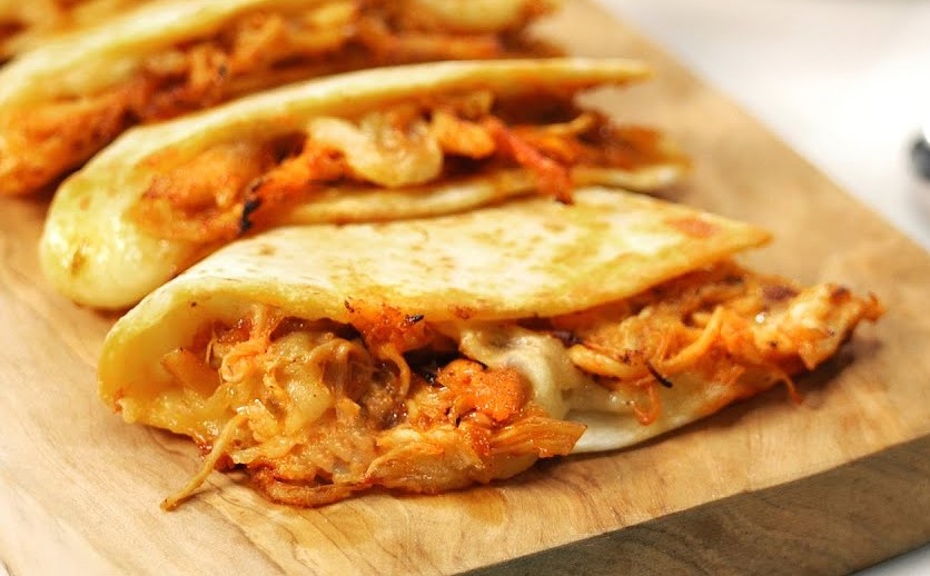 TORTILLA DE HARINA, PASTOR, COBOLLA, CHORIZO Y QUESO.