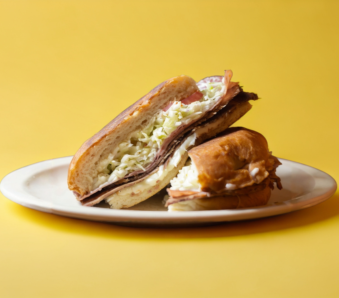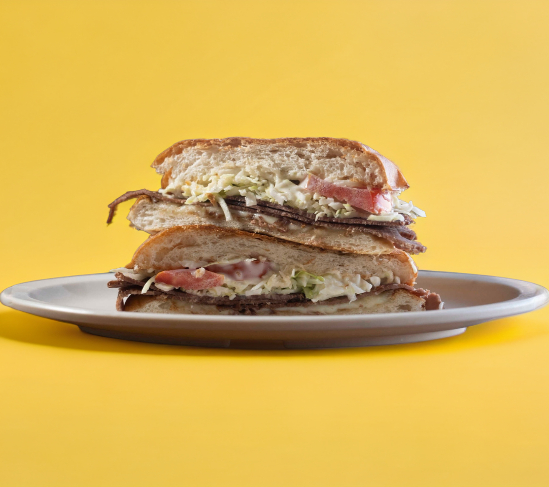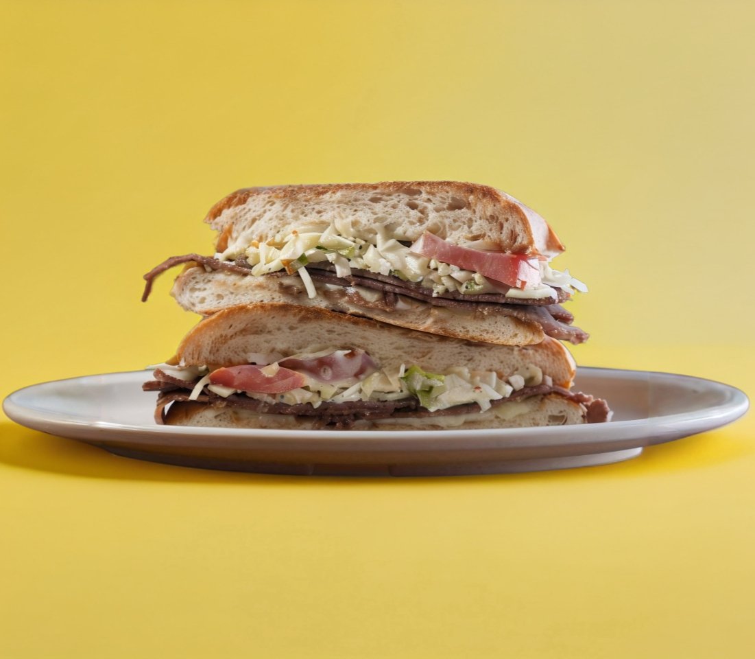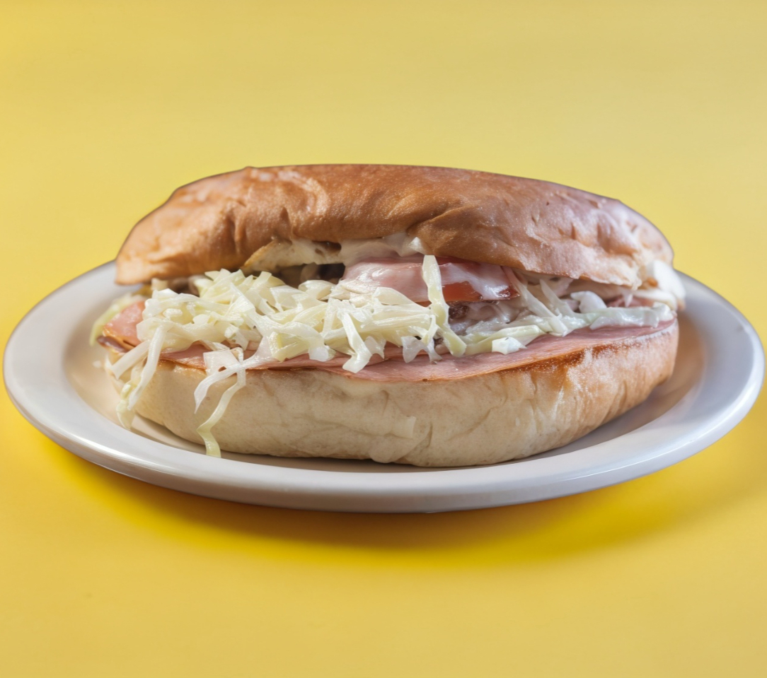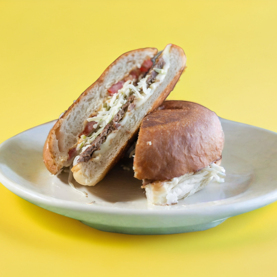 Deliciosa torta de lomo de res con jamón y asadero. Preparada con ensalada de repollo, aderezo y tomate. No incluye aguacate.