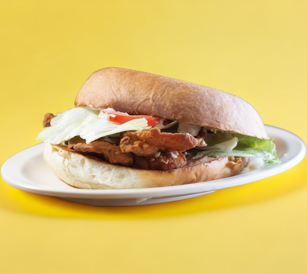 Torta de pechuga de pollo empanizado, preparada con lechuga, tomate y aderezos. No incluye aguacate.