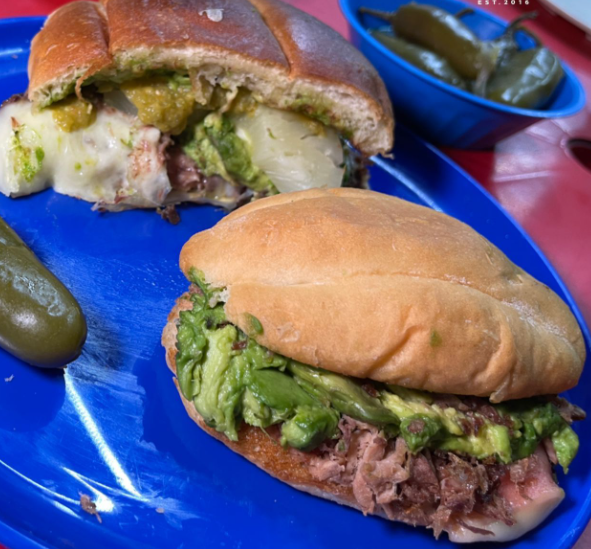Jamón, queso, aguacate, carne desherbada, frijoles, el pan tostado con mantequilla, deliciosos queso asadero, incluye salsa.