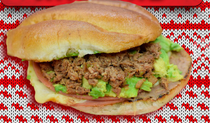 Jamón, queso, aguacate, carne deshebrada, frijoles.