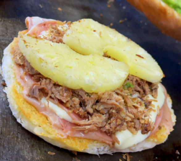 Jamón, queso, aguacate, carne desherbada, frijoles, el pan tostado con mantequilla, deliciosos porción de piña, incluye salsa.