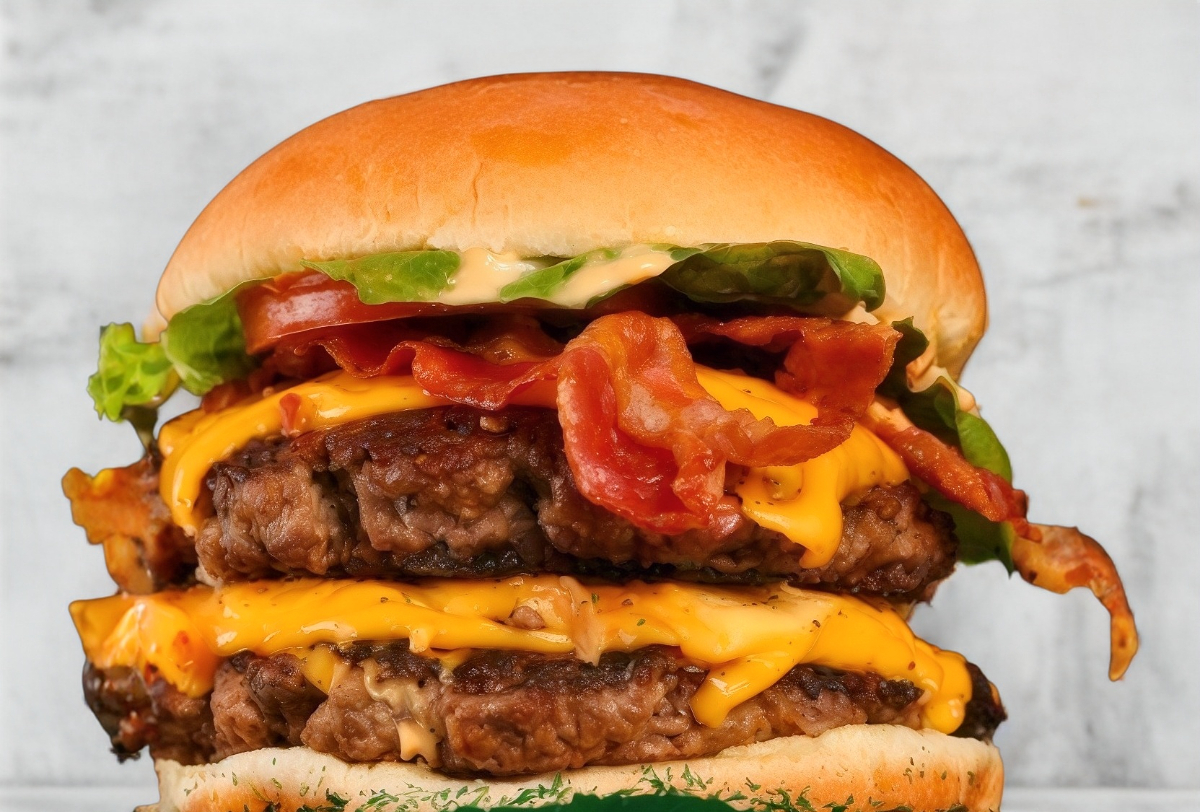doble carne, doble tocino, lechuga, tomate , doble queso y cebollas asadas, con papas o ensalada