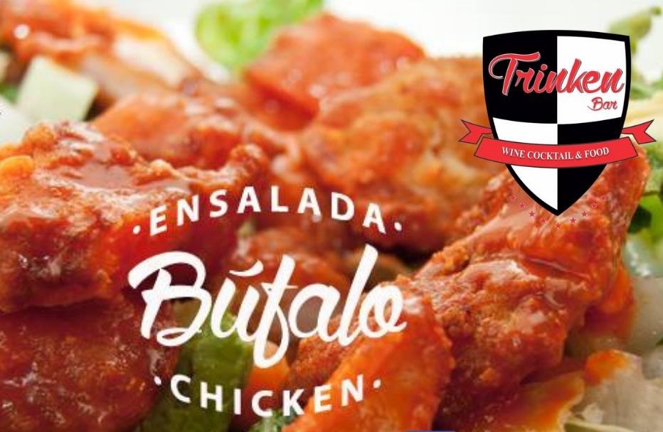 Tiras crujietes de pollo bañadas en salsa buffalo, mezcla de lechugas, apio, aderezo ranch, zanahoria y aguacate fresco
